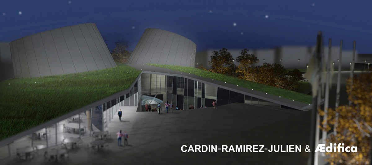 1. A criação de uma conexão física entre os visitantes e o céu, por meio de dois volumes principais, que sugerem instrumentos de observação astronômica, e que abrigam as duas esferas dos teatros.