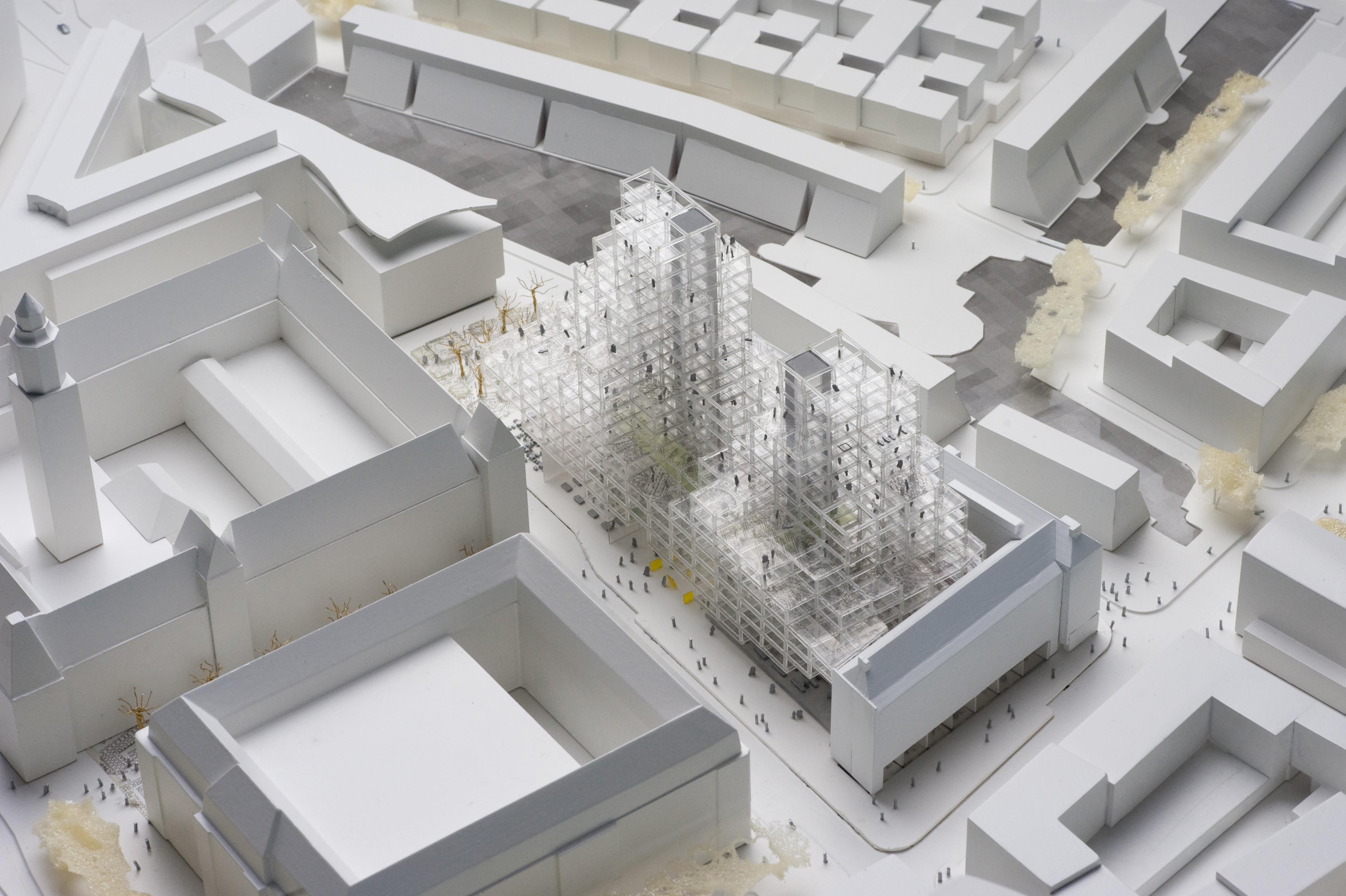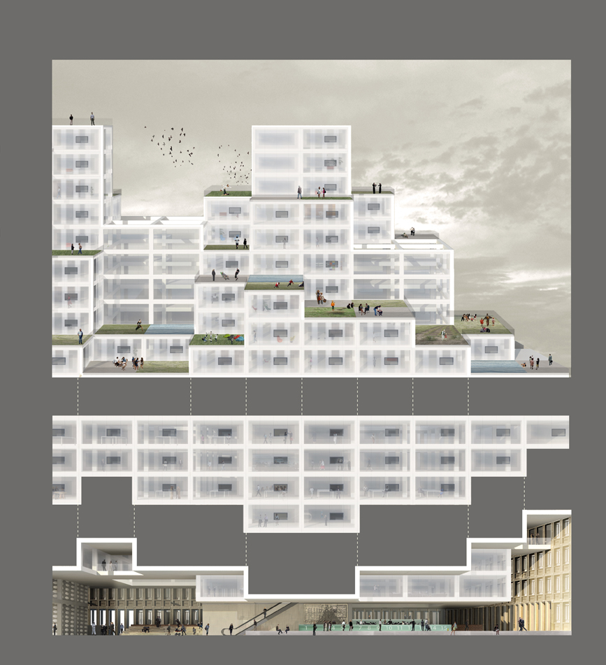 O projeto do OMA foi concebido como um edifício modular constituído de unidades que se repetem e que são recuadas gradualmente em relação à rua e que crescem de forma irregular. A idéia, segundo os arquitetos, é permitir máxima eficiência e versatilidade, tanto na construção quanto no programa: as unidades podem ser adicionadas ou suprimidas da estrutura em função das mudanças na demanda por espaços, sejam de escritórios ou residências. Além disso, terraços verdes nos níveis mais altos oferecem a possibilidade de apartamentos com jardins, em meio ao núcleo urbano da cidade.