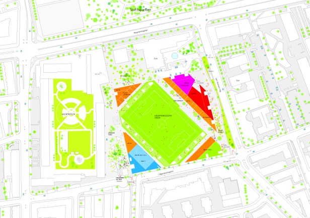 Concebido como uma “vila”, e não como um simples complexo esportivo, o projeto combina as edificações individuais a uma variedade de usos com espaços abertos e jardins públicos. As coberturas inclinadas e os volumes alternados dos edifícios reduz a escala do complexo em relação ao entorno. As ruas internas, animadas pelas funções públicas do programa, fazem referência aos centros medievais, abrigando todos os aspectos da vida humana – os prazeres da vida cotidiana, o trabalho e a diversão.