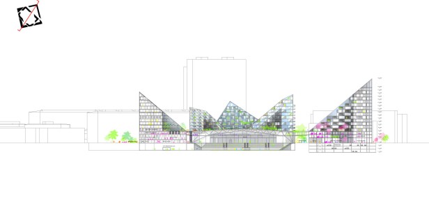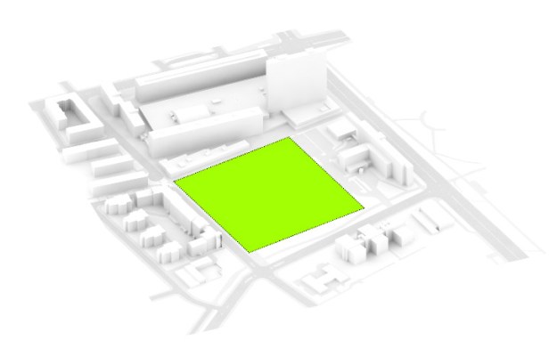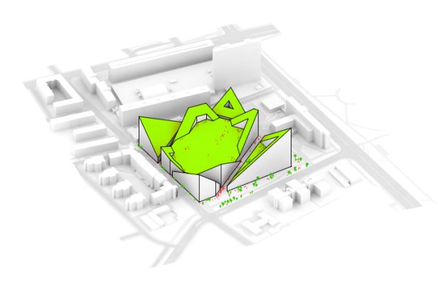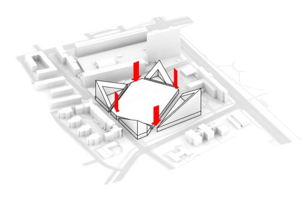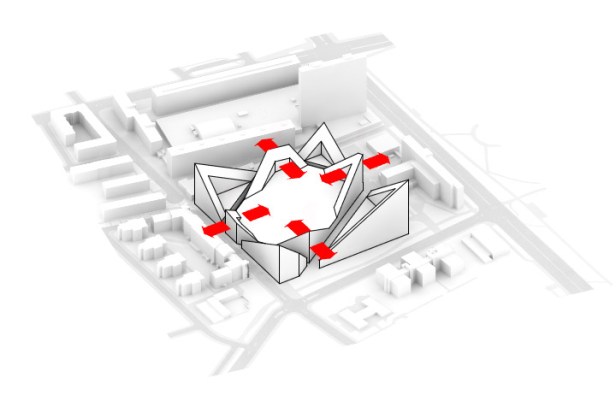 Segundo os arquitetos, o pátio central é largo o suficiente para acomodar jogos de futebol profissional, assim como concertos, conferências, exibições e feiras. Mas ao invés de ser concebido como uma arena esportiva introspectiva, que se fecha para a cidade, o que se propõe é “um espaço público aberto e convidativo, visível a partir de todas as ruas circundantes, oferecendo de maneira generosa a vida e a dinâmica do interior àqueles qu passam nos arredores. A rede de pedestres criada em torno do pátio central se conecta com a rede de ruas da cidade e com as galerias internas, fazendo do conjunto um ecosistema completo da vida urbana.”