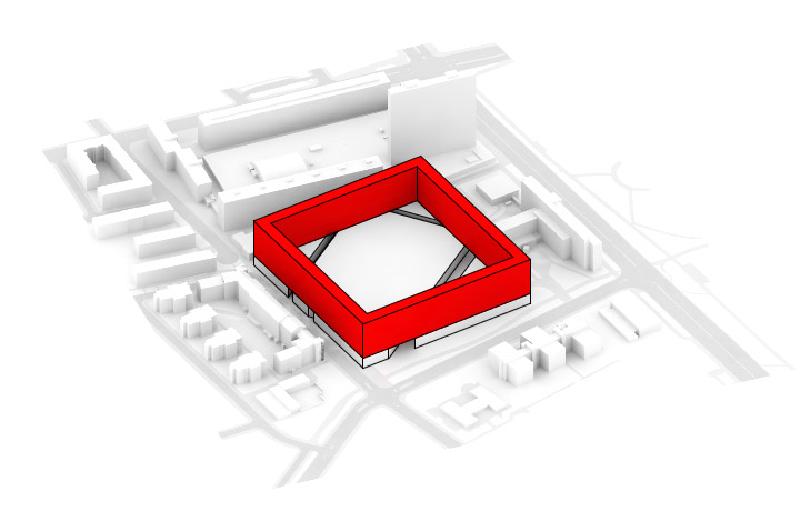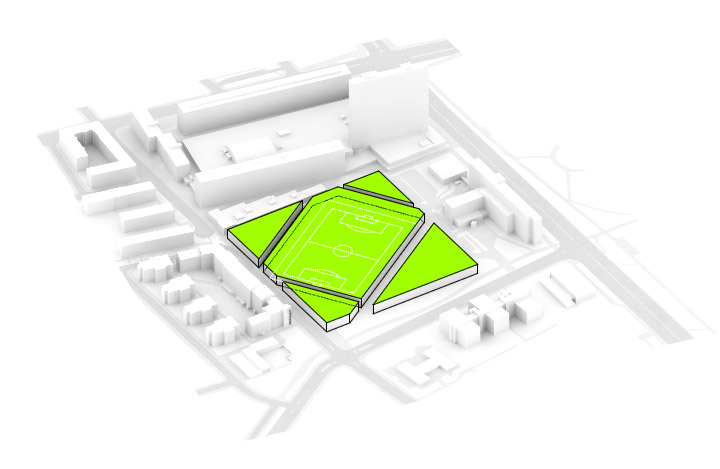 Segundo os arquitetos, o pátio central é largo o suficiente para acomodar jogos de futebol profissional, assim como concertos, conferências, exibições e feiras. Mas ao invés de ser concebido como uma arena esportiva introspectiva, que se fecha para a cidade, o que se propõe é “um espaço público aberto e convidativo, visível a partir de todas as ruas circundantes, oferecendo de maneira generosa a vida e a dinâmica do interior àqueles qu passam nos arredores. A rede de pedestres criada em torno do pátio central se conecta com a rede de ruas da cidade e com as galerias internas, fazendo do conjunto um ecosistema completo da vida urbana.”