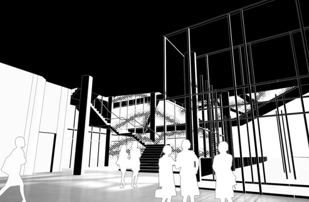 O projeto do Centro de Artes de Gimpo enfatiza o acesso livre dos pedestres e a integração com o entorno urbano. Para isso, o edifício foi concebido como um bloco suspenso, criando uma espécie de praça no pavimento térreo, que se integra ao passeio público.