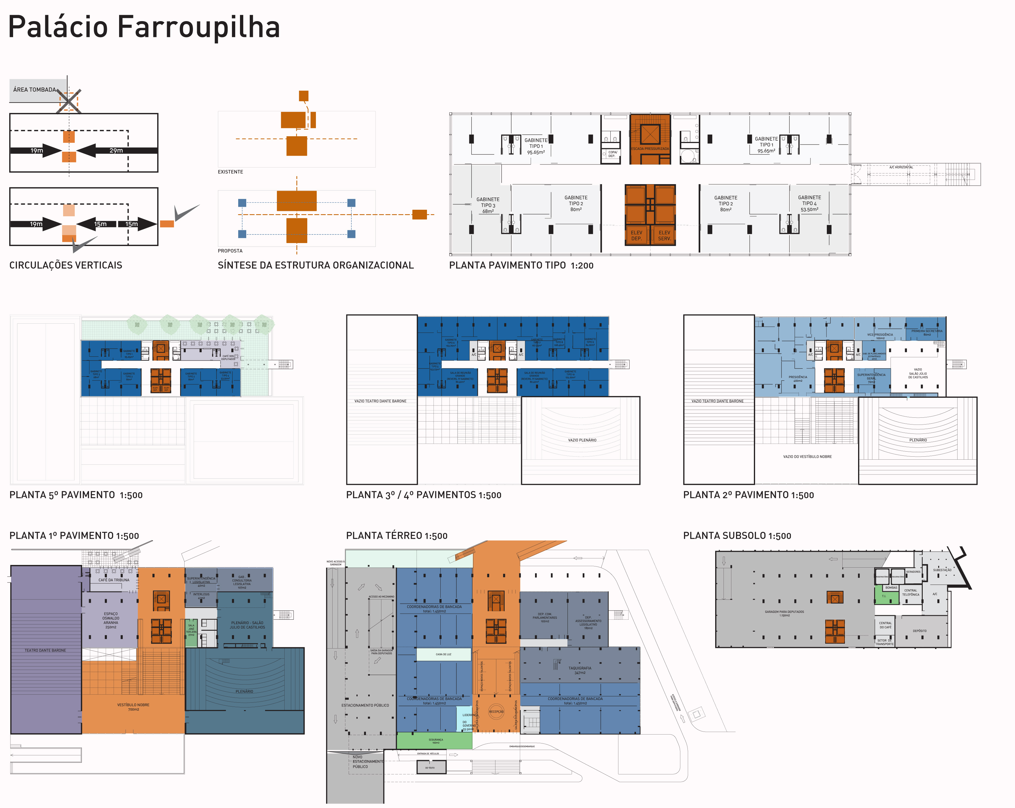 ° Reorganização dos setores existentes dentro do edifício, por uso, e sua redistribuição dentro do próprio Palácio e Complexo da ALERGS, além do aumento da quantidade dos gabinetes dos deputados totalizando: 54 gabinetes de dimensões variáveis, mais 5 gabinetes extras, e 4 salas de reuniões; sendo todos os espaços devidamente modulados e que poderão ser futuramente convertidos em outros gabinetes. Atingimos assim uma área media geral de 90 m² por gabinete.
