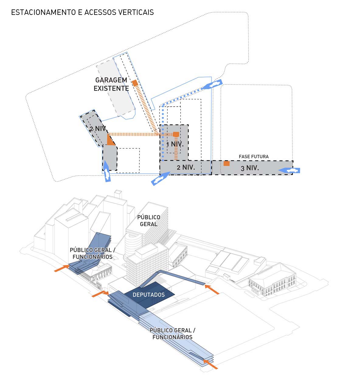 ° Duplicação da capacidade de vagas do estacionamento do subsolo por meio da realocação dos vestiários e refeitório dos funcionários para o Anexo I, deixando seu uso exclusivo para os deputados, além de prever a implantação de um novo estacionamento sob a praça Marechal Deodoro, interligado ao estacionamento existente, e reorganização dos acessos e saídas.