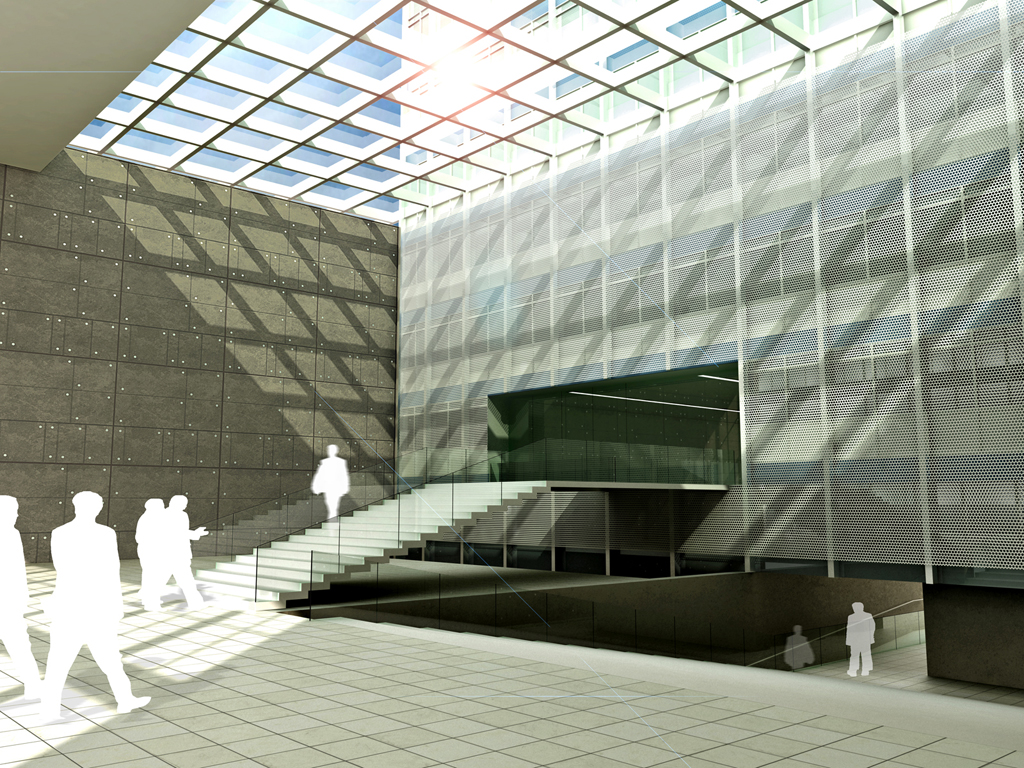 ° Incorporação das áreas anexas ao vestíbulo nobre e fechamento da abertura superior com cobertura transparente, criando um grande espaço vazio como poética, representativo do Estado do Rio Grande do Sul.