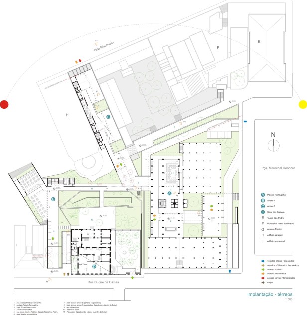 O zoneamento é claro, e está dividido em três grandes áreas: 1. Área pública e cultural (Solar dos Câmara e Anexo 1); 2. Área técnico-administrativa e de serviços (Anexo 3); 3. Atividades parlamentares (Palácio Farroupilha).