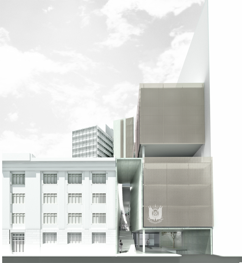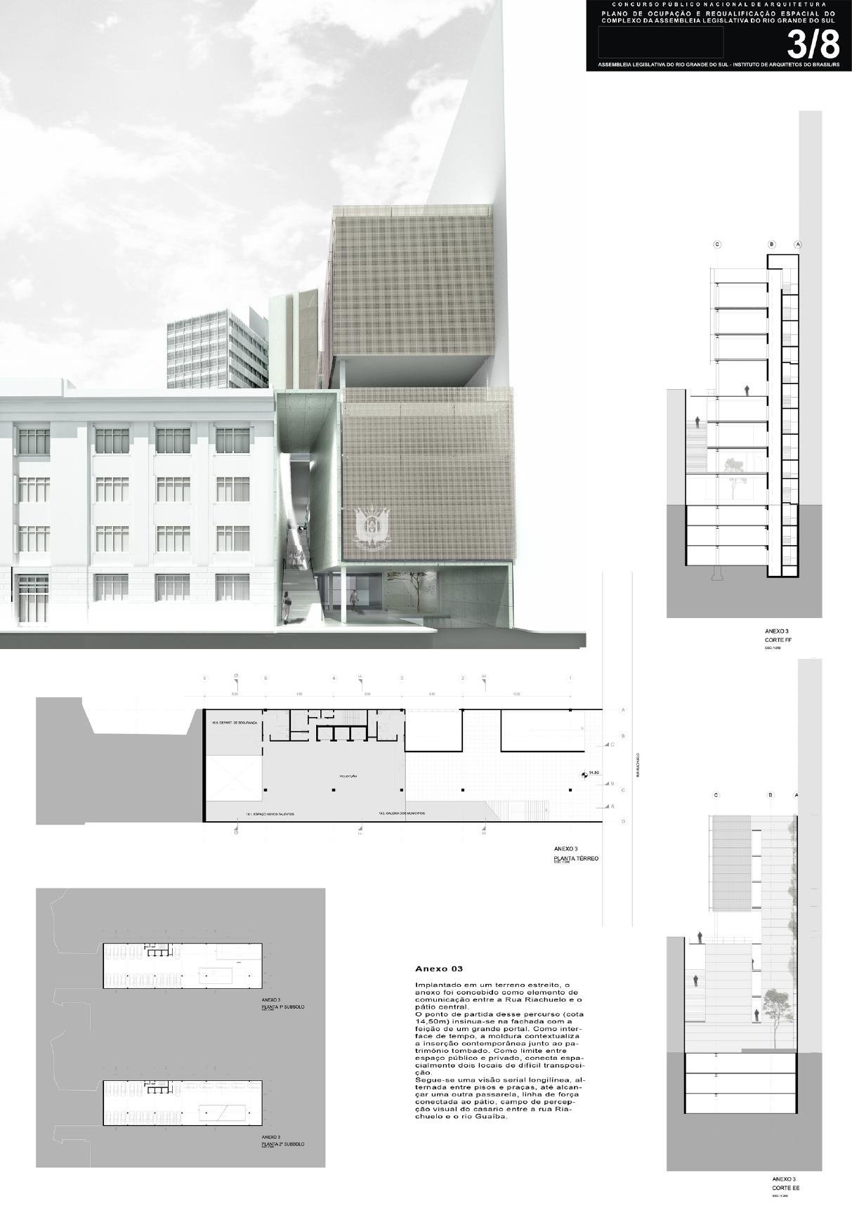 O Anexo 03 foi concebido como elemento de comunicação e transposição entre a rua Riachuelo e o pátio central, uma nova interface entre espaços publico e privado. O ponto de partida desse percurso insinua-se na fachada com a feição de um grande portal e atravessa em visão serial todo o percurso através de pisos e praças.