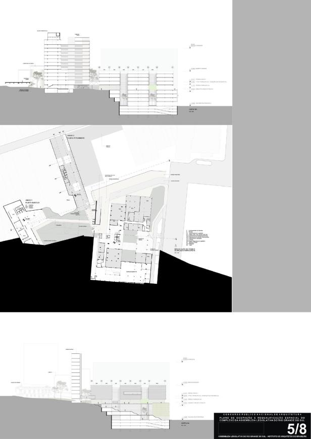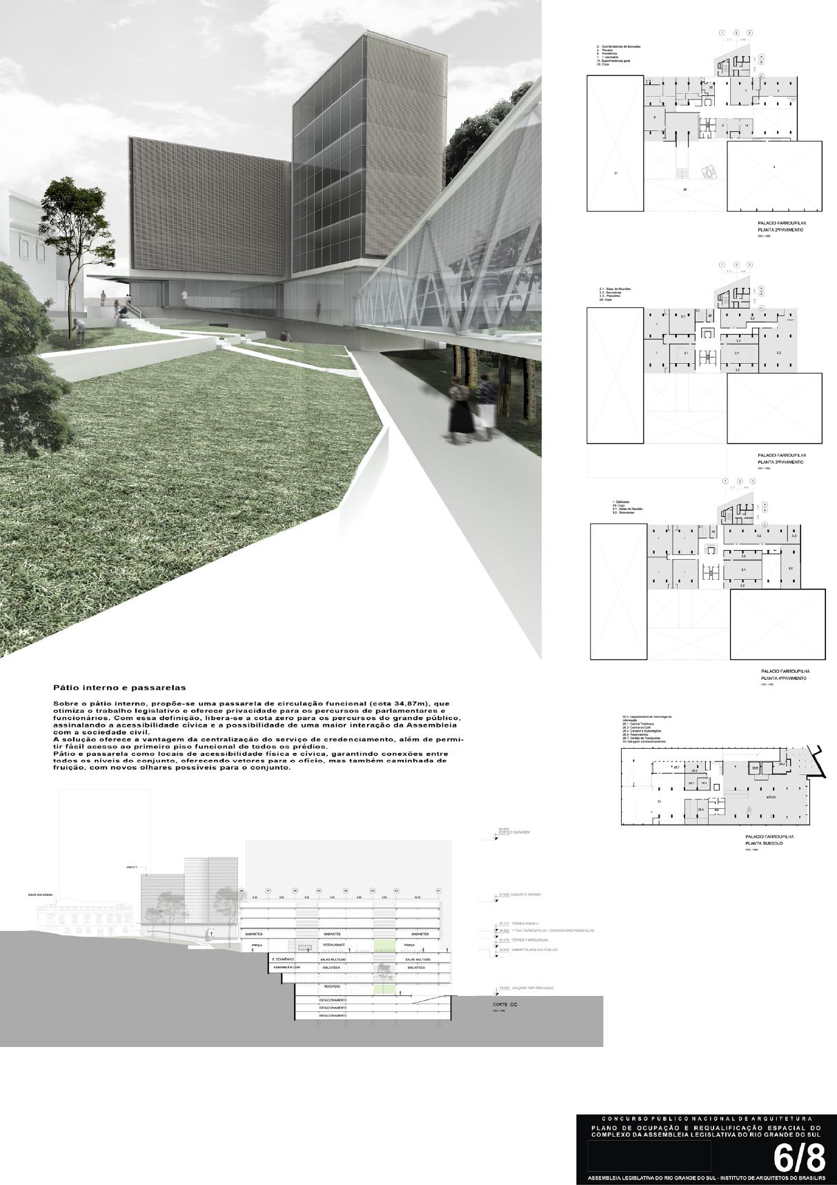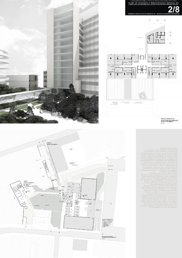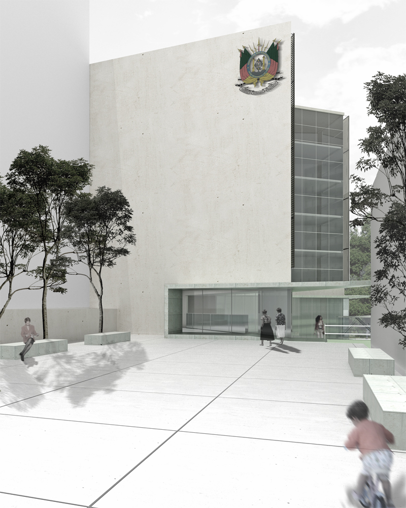 No Palácio Farroupilha, o resgate da potência da planta livre e da escala do edifício estão consolidados na conversão da via lateral em alameda, construção de torre de serviços, requalificação do vestíbulo nobre, acesso pelo piso inferior e ampliação dos gabinetes dos deputados.