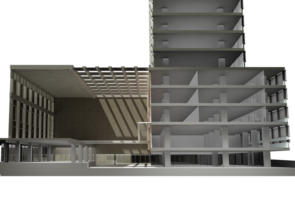 Para melhoria da circulação vertical foi proposta um novo núcleo, que passa por todos os pavimentos, com dois elevadores, uma caixa de escada, serviços e um shaft para passagem de novas instalações.