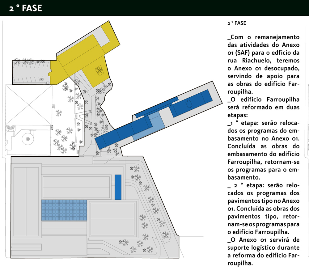 Para o terreno da rua Riachuelo foi proposto um edifício que abriga algumas funções remanejadas do Farroupilha e todo o programa que outrora estava no anexo I. Isso permite que se tenha uma maior densidade no complexo ao utilizar todo o potencial construtivo deste terreno.