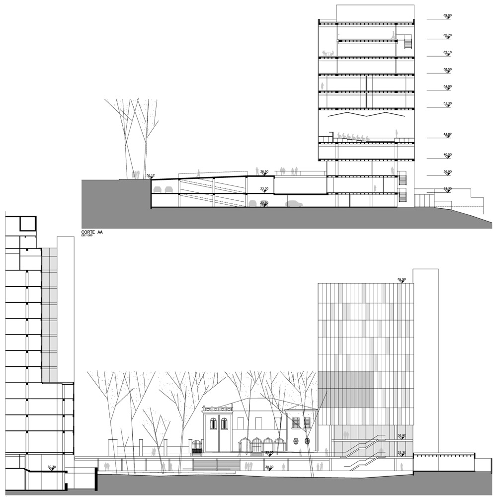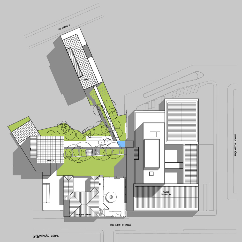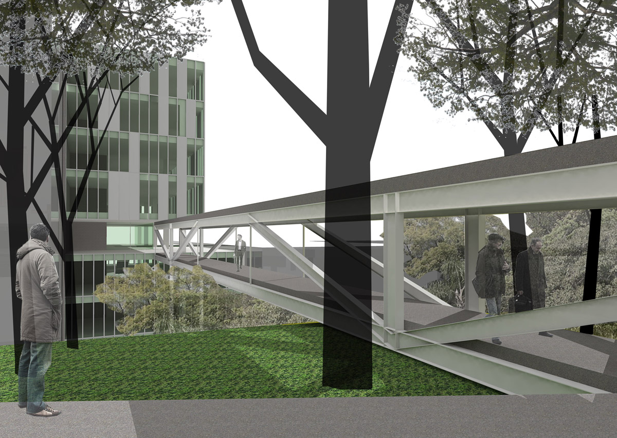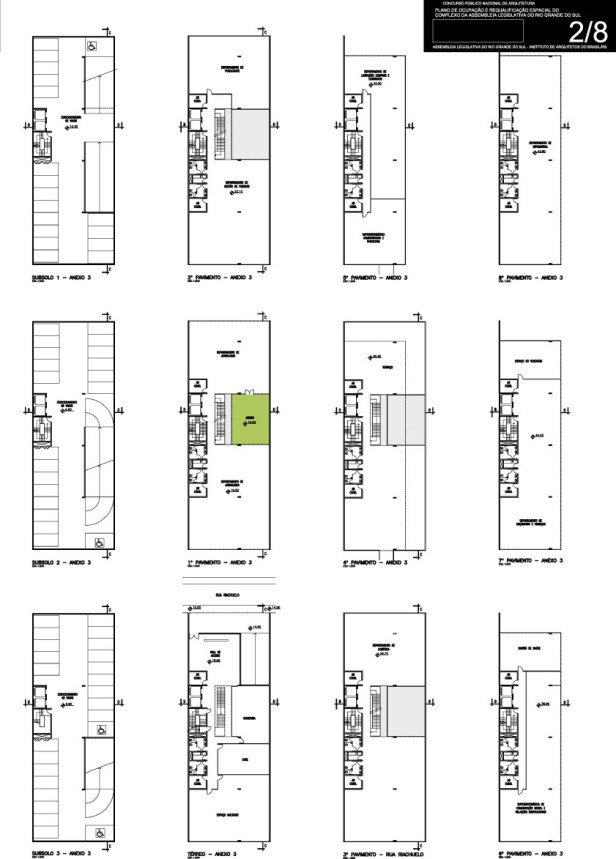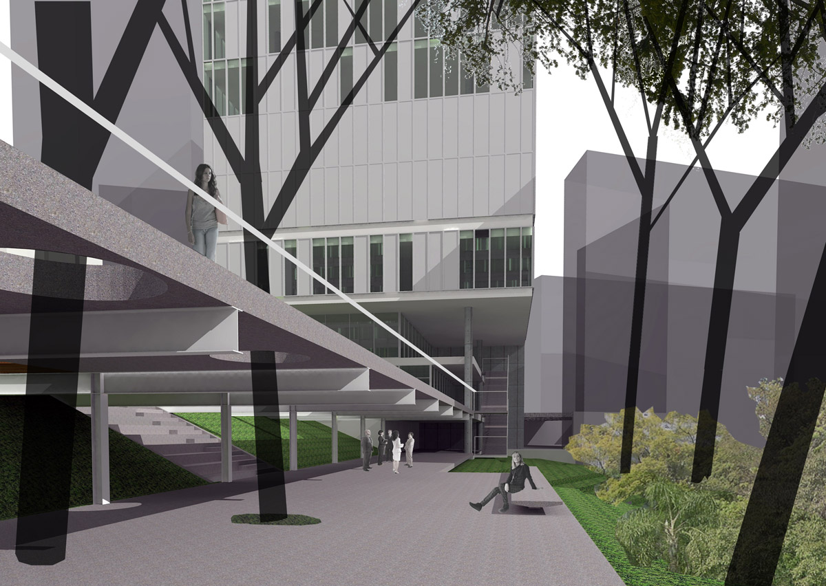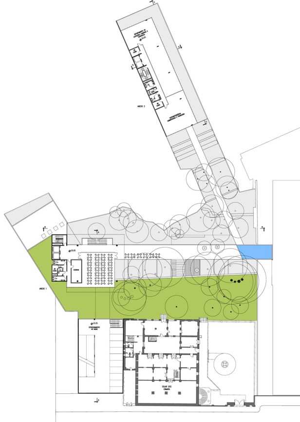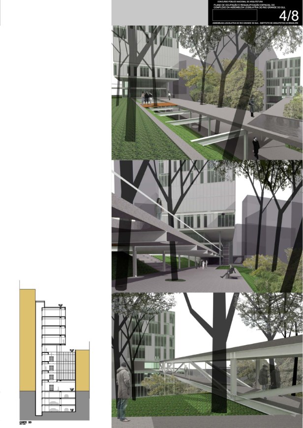 A fim de atender as principais solicitações do edital – um plano de integração das diferentes áreas do ALERGS e ampliação do espaço físico – é proposta a reestruturação das circulações de todos os edifícios do complexo, inclusive a substituição do anexo 1 por um novo edifício.