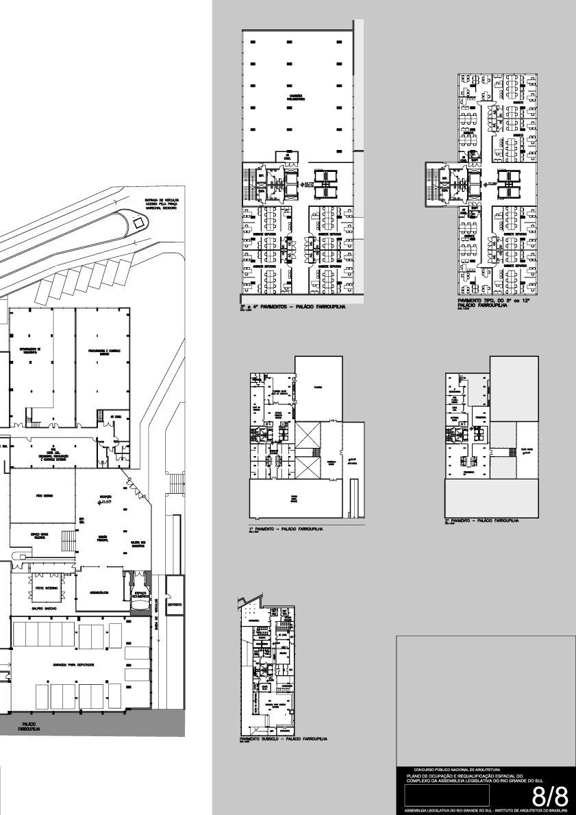 O Palácio Farroupilha concentrará as atividades parlamentares principais (gabinetes de deputados, presidência, plenário e atividades de apoio, fórum e teatro). A torre de circulação e serviços proposta é compacta, implanta-se junto à antiga circulação que será demolida e é resolvida de maneira a possibilitar a ampliação da rampa de acesso à garagem do subsolo, evitando a rota confusa hoje feita pelos carros e que conflita com a circulação de pedestres para o complexo.