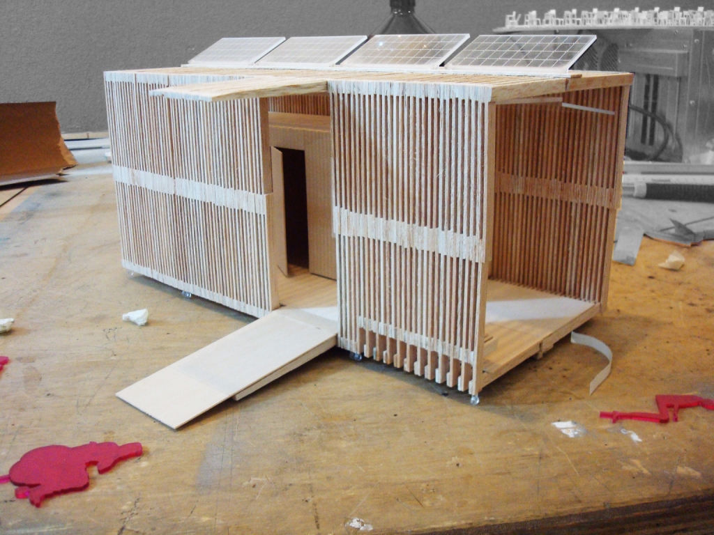 Considerando a facilidade e a rapidez de execução, são ressaltados os benefícios da utilização da madeira. A partir do estudo de suas propriedades, foram definidos o desenho e o dimensionamento das peças que compunham o sistema, visando principalmente a otimização do material. O sistema de ripas permite a ventilação cruzada dos ambientes.