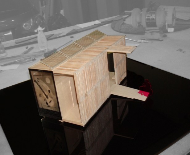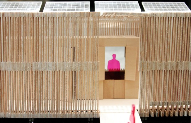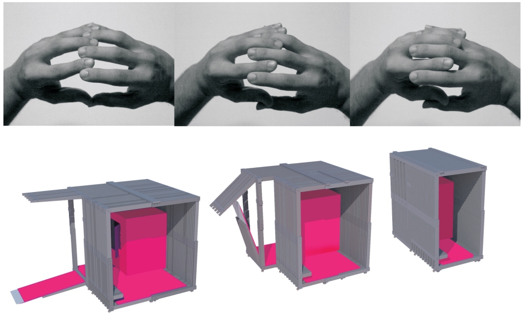 O objeto mal toca o chão, sustentando-se sobre um sistema de rodas e apoios fixos. O sistema de intervalos desencontrados do ripado permite que os módulos da circulação deslizem sobre os módulos dos espaços de vivência. Sendo assim, o fechamento para a segurança do quiosque requer um movimento que transforma o aspecto do objeto como um todo.