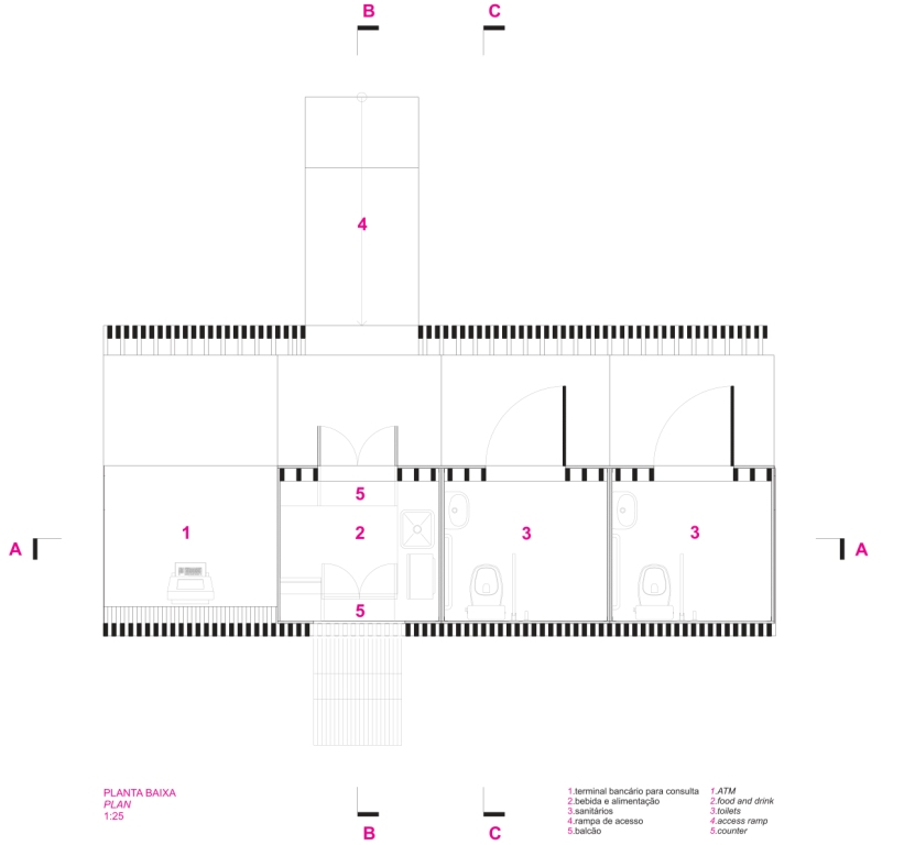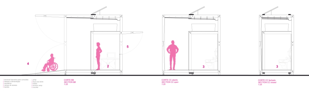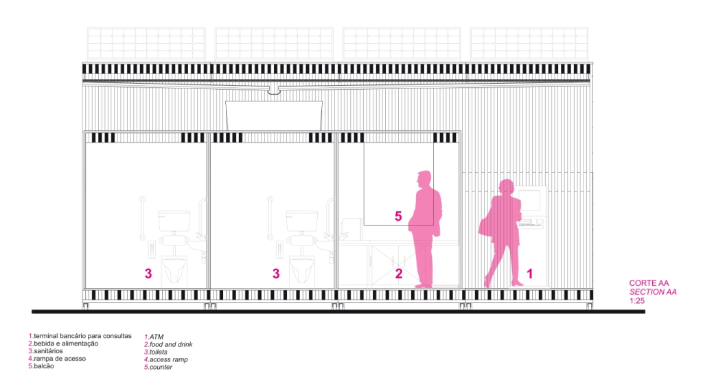 A flexibilidade do sistema permite uma multi funcionalidade de seus componentes. A rampa de acesso e o balcão do bar, por exemplo, tornam-se paredes, permitindo o fechamento do quiosque. Da mesma forma, painéis externos se transformam em espaços de comunicação e publicidade, bancos e bicicletários são criados a partir de alguns módulos de ripas.