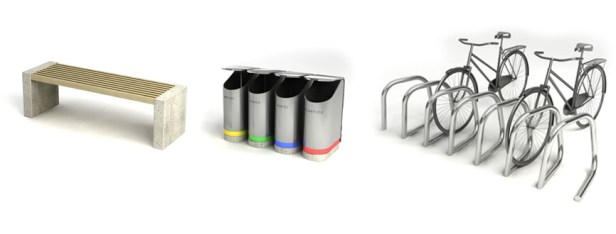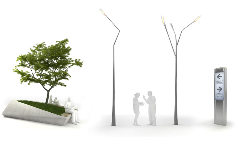 Os elementos vão desde singelas barreiras para veículos até dois interessantes tipos de luminárias, de bancos austeros a exóticas floreiras com bancadas para sentar, ainda, não menos importante: bebedouro, bicicletário, totem de sinalização, cabine telefônica, lixeiras com separação de lixo, estande para Feira do Livro e pequenos módulos para ponto comercial.
