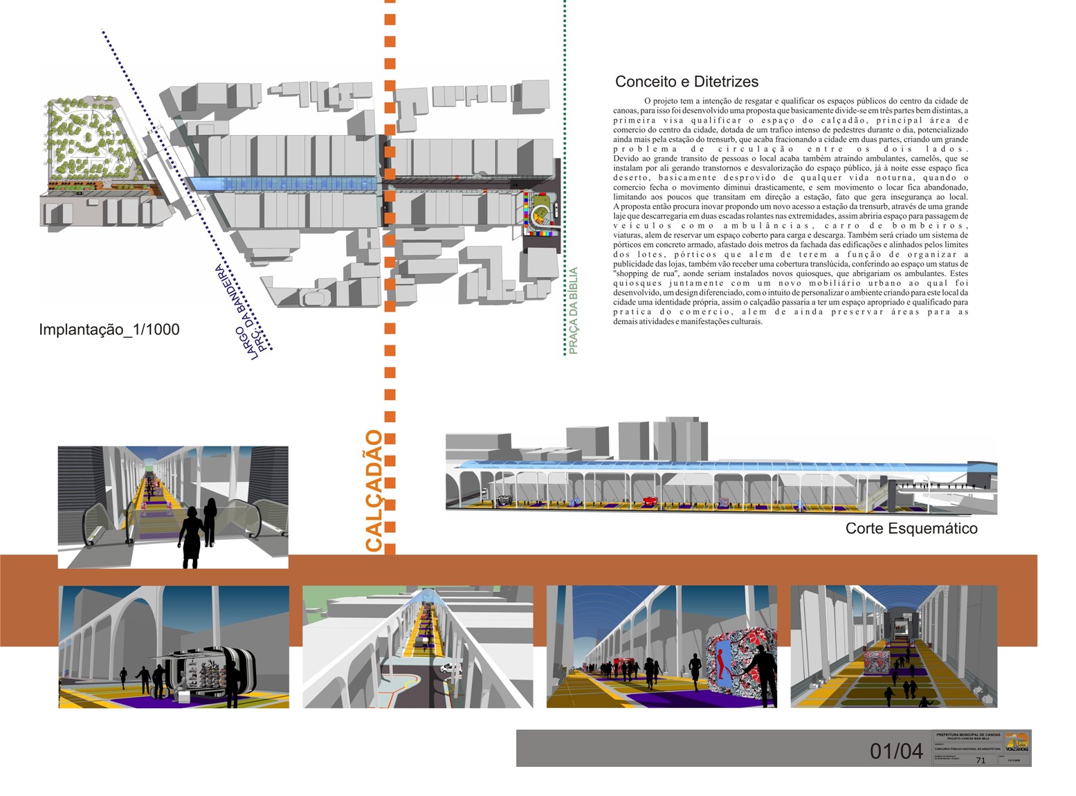 O projeto tem a intenção de resgatar e qualificar os espaços públicos do centro da cidade de canoas, para isso foi desenvolvido uma proposta que basicamente divide-se em três partes bem distintas, a primeira visa qualificar o espaço do calçadão, principal área de comercio do centro da cidade, dotada de um trafico intenso de pedestres durante o dia, potencializado ainda mais pela estação do trensurb, que acaba fracionando a cidade em duas partes, criando um grande problema de circulação entre os dois lados.
