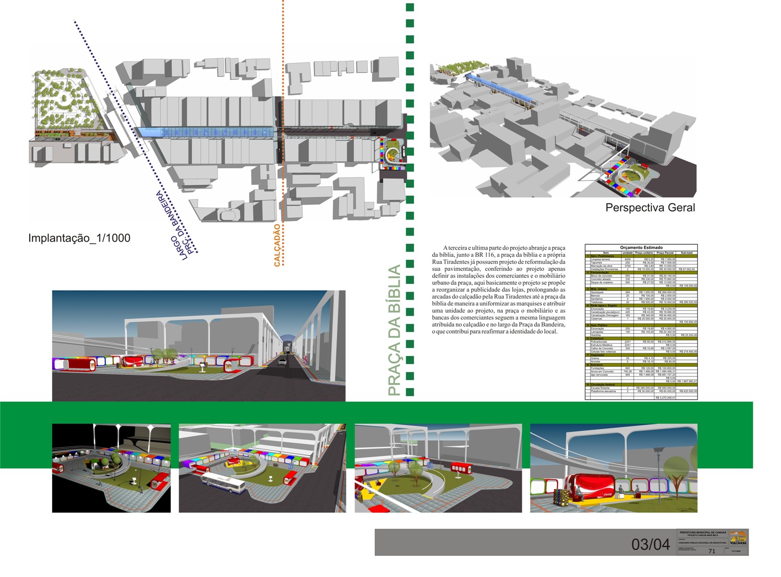A terceira e ultima parte do projeto abranje a praça da bíblia, junto a BR 116, a praça da bíblia e a própria Rua Tiradentes já possuem projeto de reformulação da sua pavimentação, conferindo ao projeto apenas definir as instalações dos comerciantes e o mobiliário urbano da praça, aqui basicamente o projeto se propõe a reorganizar a publicidade das lojas, prolongando as arcadas do calçadão pela Rua Tiradentes até a praça da bíblia de maneira a uniformizar as marquises e atribuir uma unidade ao projeto, na praça o mobiliário e as bancas dos comerciantes seguem a mesma linguagem atribuída no calçadão e no largo da Praça da Bandeira, o que contribui para reafirmar a identidade do local.
