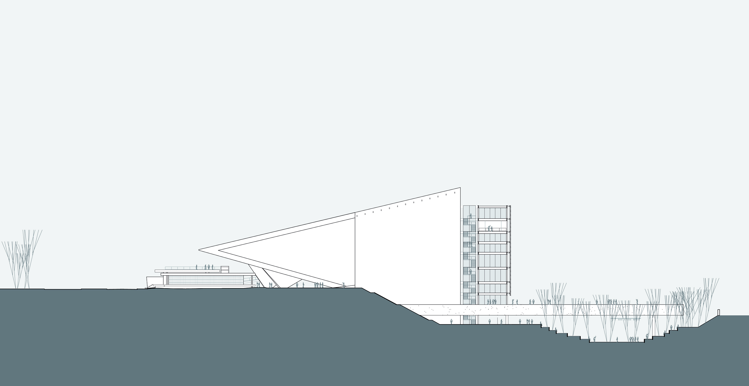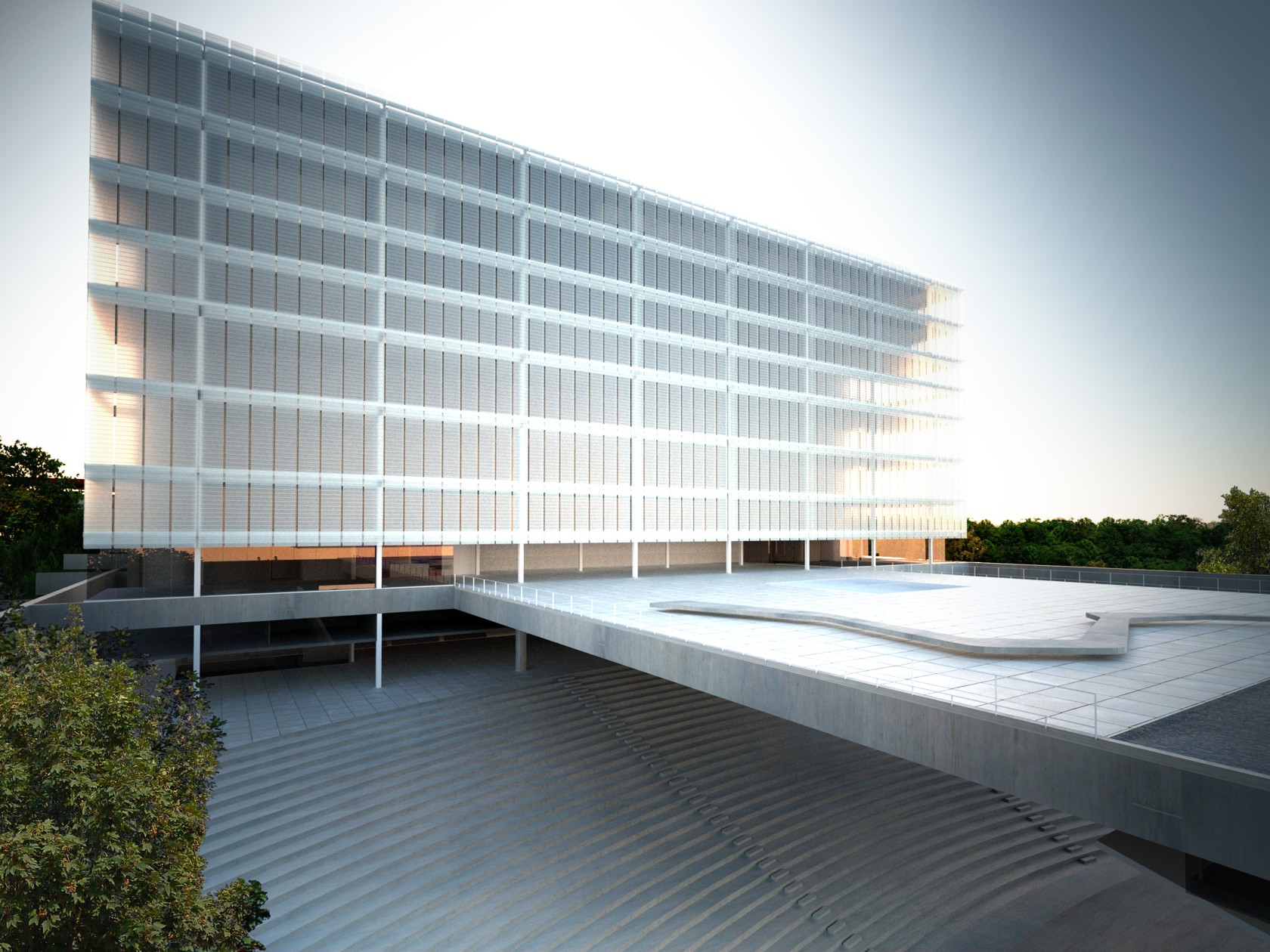 A praça, pátio aéreo, resultante da operação de cobertura do anfiteatro externo é o elemento público protagonista, como reflexo do espaço público da frente oposta, o Campo Grande.