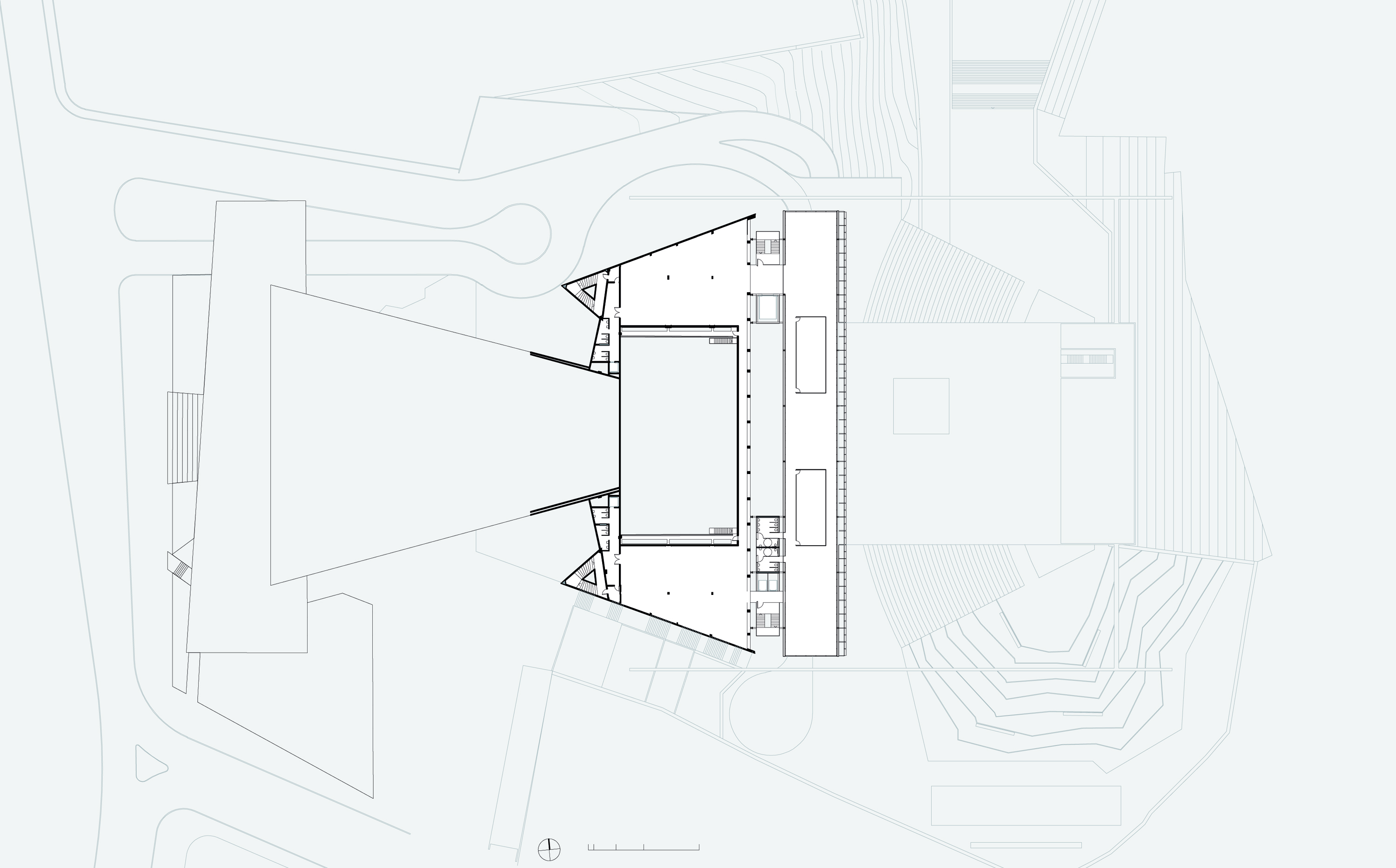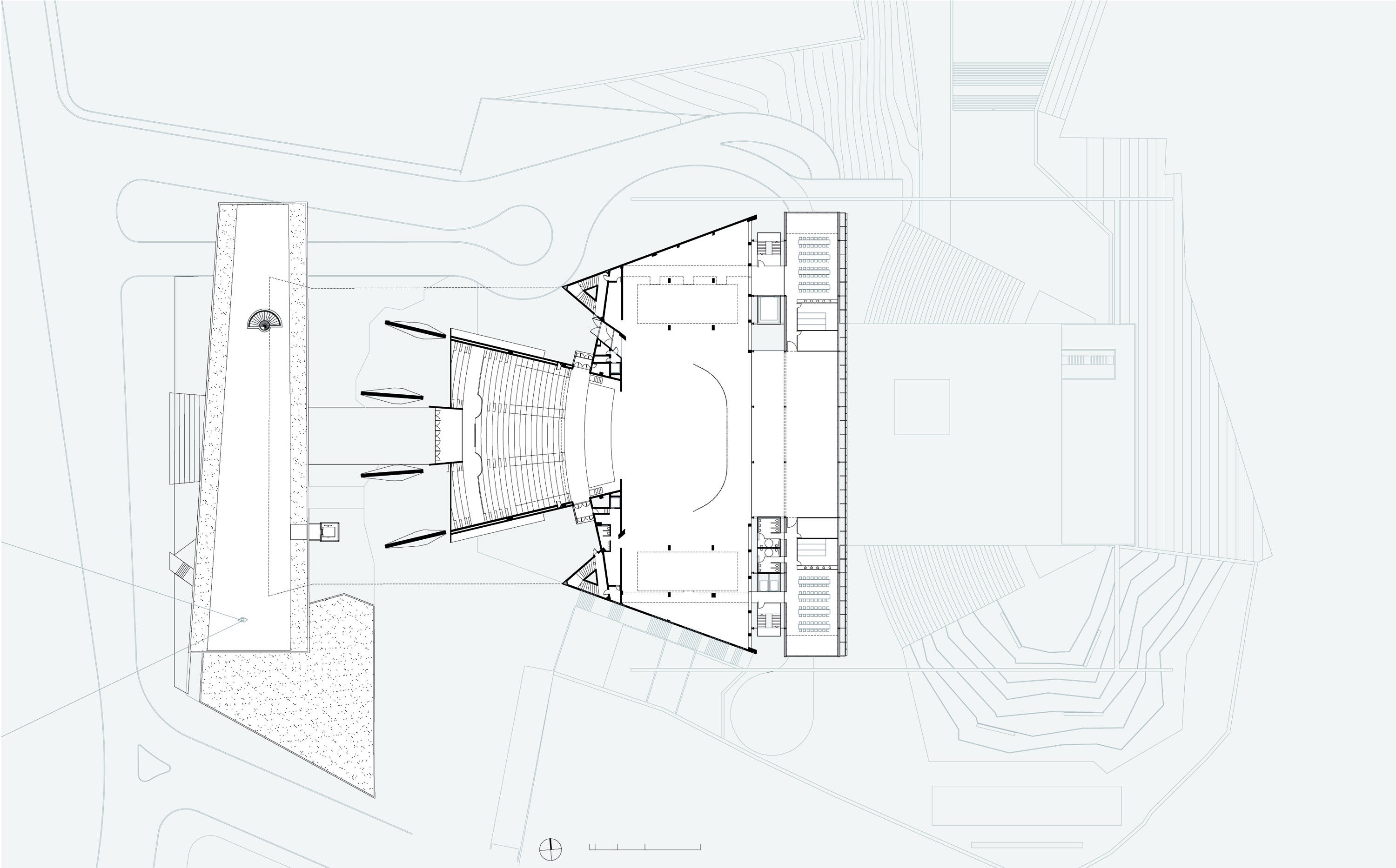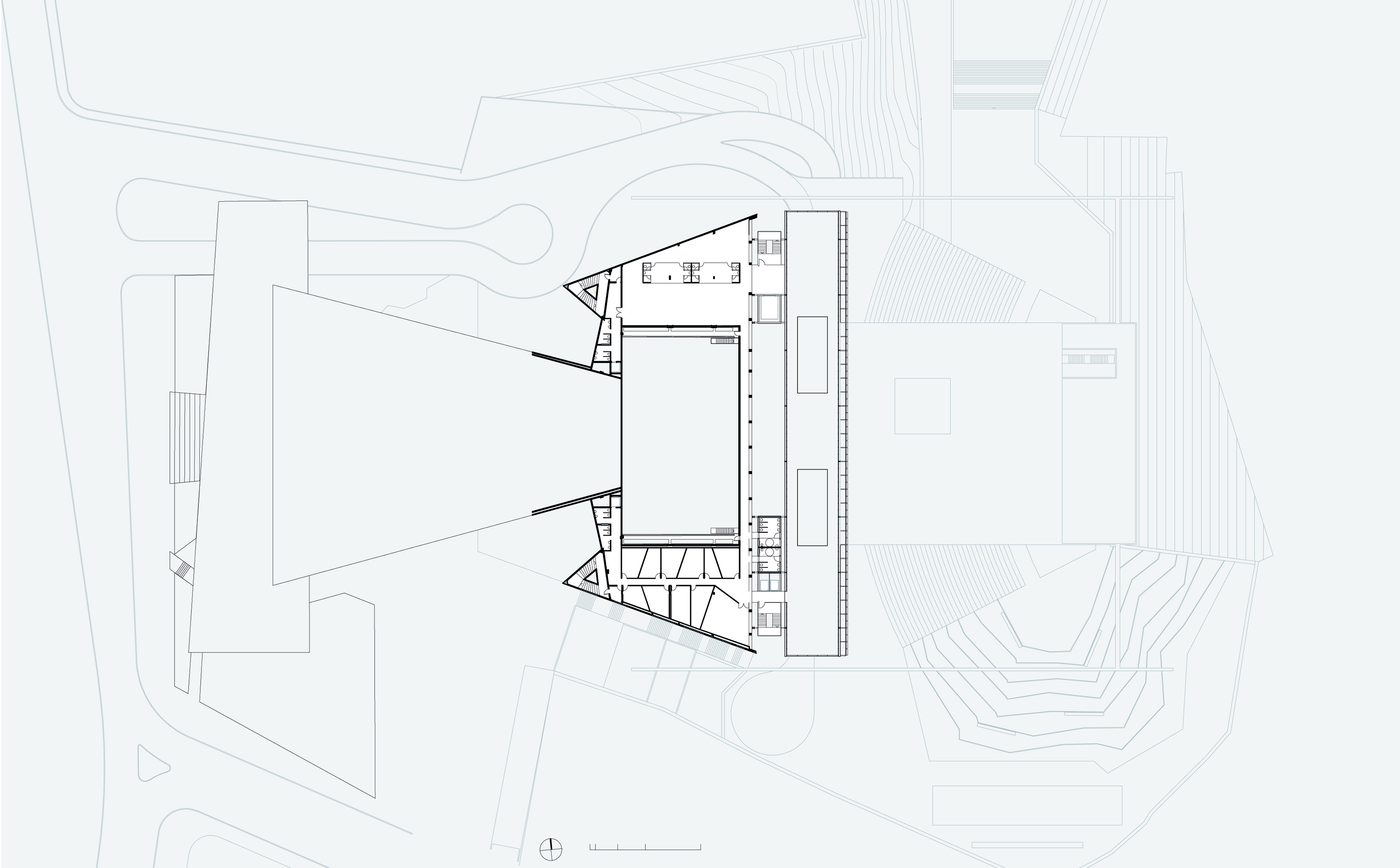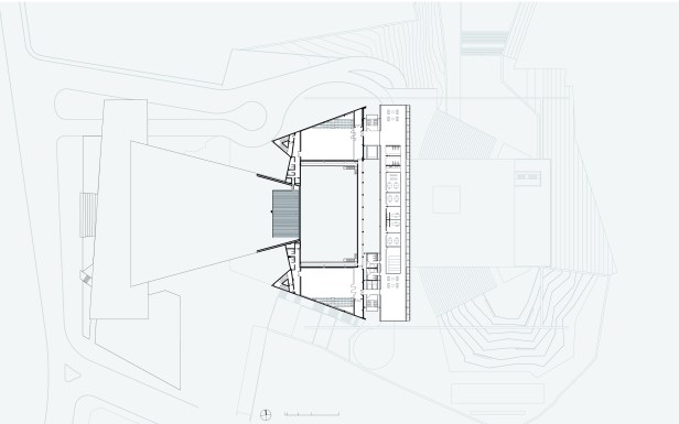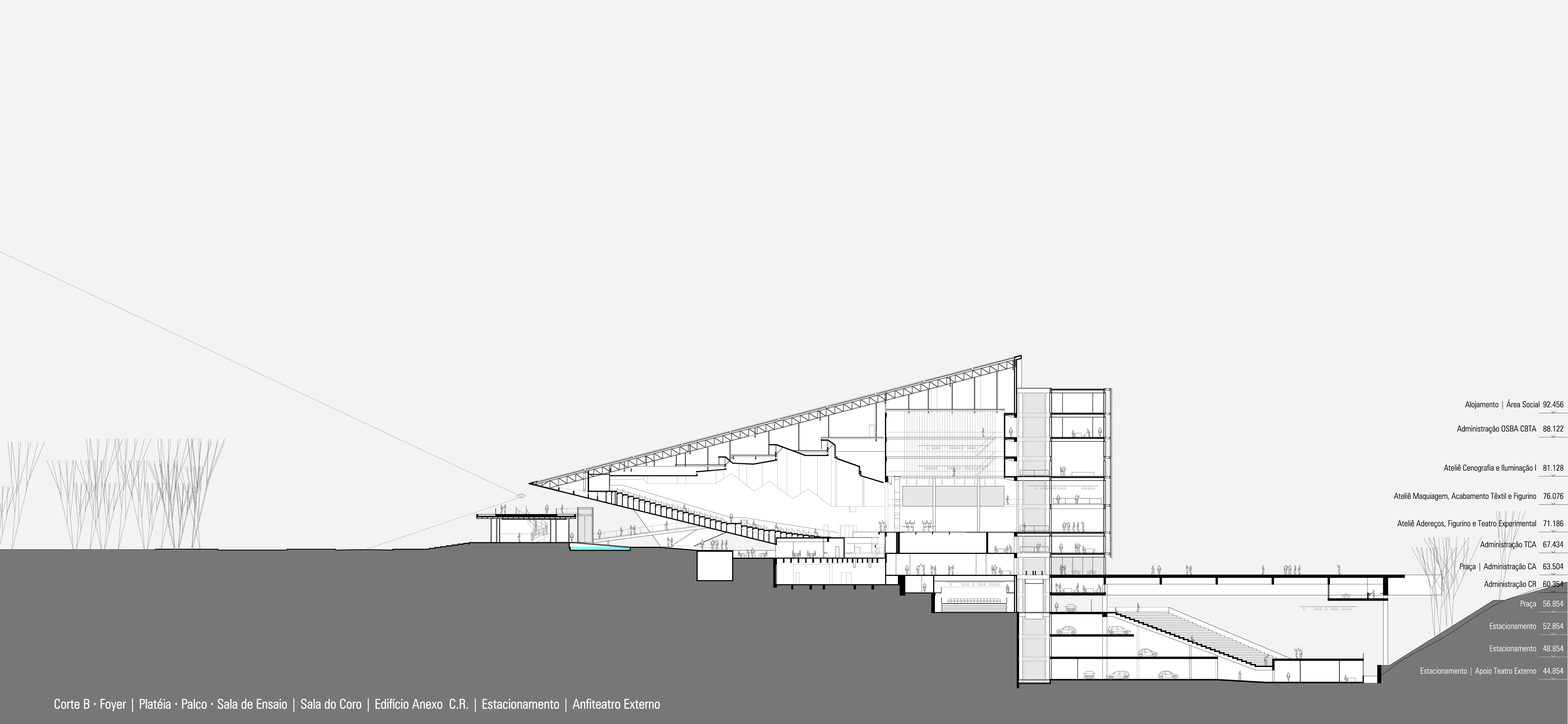 A construção na nova platéia organiza e resolve simultaneamente a construção da estrutura de estacionamento que não se configura propriamente como um subsolo, mas toma partido da situação topográfica, além de se associar a estrutura do anexo, das prumadas de circulações e serviços, e servir diretamente ao novo conjunto, abrigando não somente vagas de veículos, mas atividades de serviços e apoio do programa.