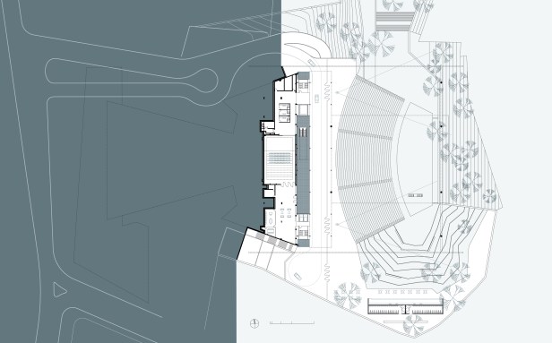 O novo Anfiteatro Externo proposto assume as premissas dos riscos originais de Fonyat e sua implantação do conjunto na borda do Campo Grande, sendo deslocado para o eixo do conjunto. Trata-se de uma operação vital e simbólica, de resgate de um elemento histórico que aponta definitivamente para o futuro o novo TCA. A antiga platéia não foi suprimida simplesmente. Integra-se ao novo anfiteatro como sua extensão natural, podendo oferecer lugares excedentes ao ar livre e, simultaneamente, aumentando a cobertura vegetal do local.