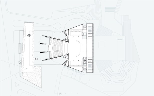 A oportunidade de revisão da ocupação da atual estrutura e a necessária ampliação da mesma, a demanda de construção de um anexo, a conformação topográfica na qual está inserida o Teatro, levam à configuração de um díptico, uma estrutura espelho que revigora o lado posterior, novos espaços que ampliam e potencializam os já existentes, valorizando o conjunto atual sem desfigurá-lo, mas ao contrário, atuam como complemento e como extensão dos espaços originais.