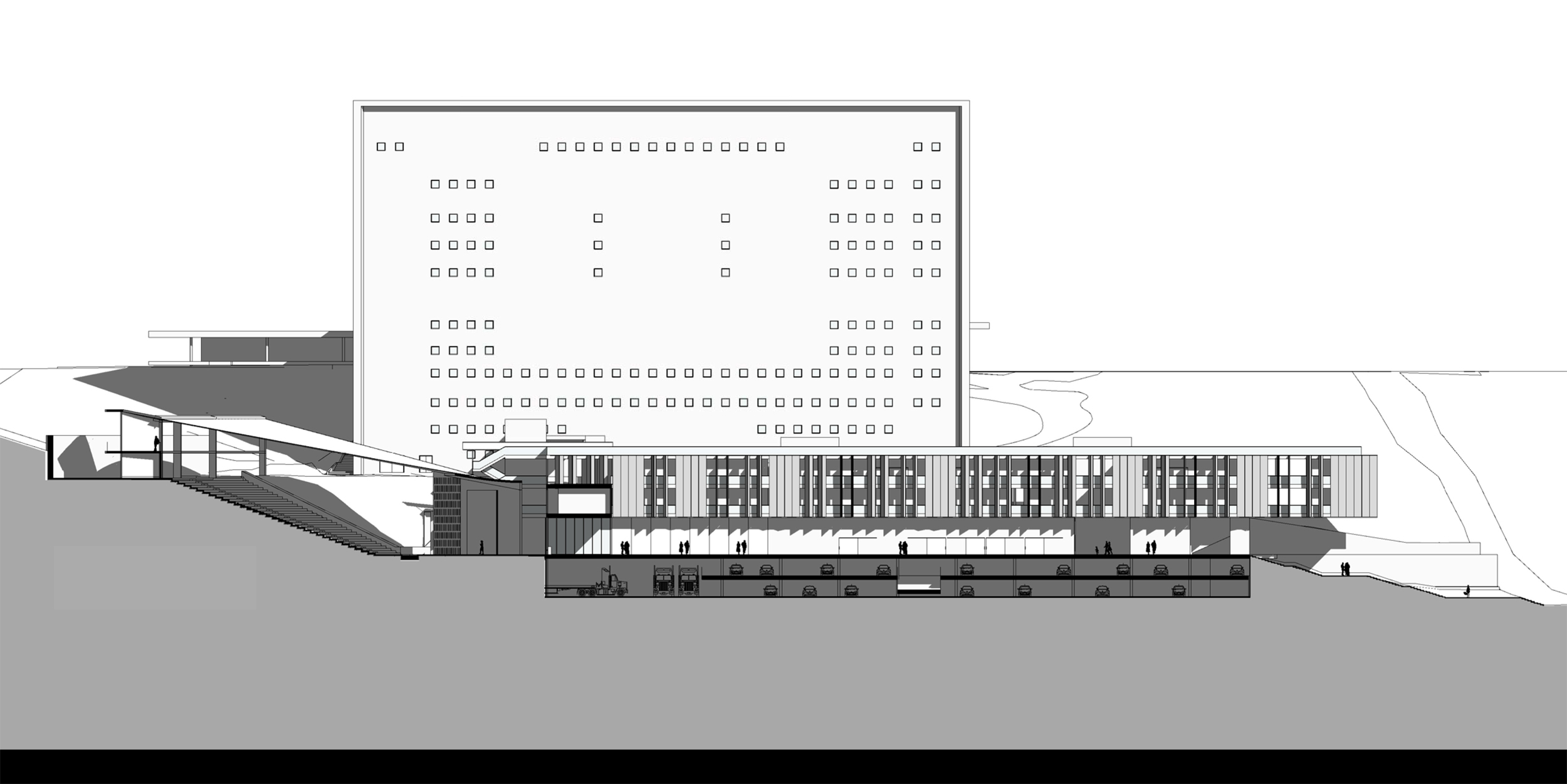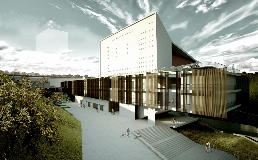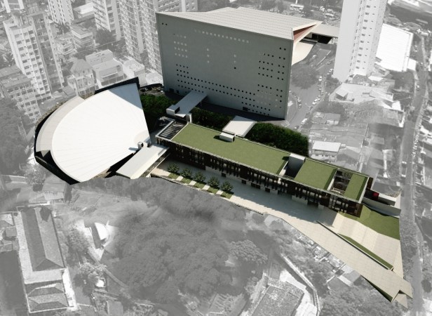 A partir da concordância com essa premissa extraída do Termo de Referência estrutura-se essa intervenção. Desse modo, propõe-se a implantação dos novos volumes edificados em cotas de nível inferiores ao edifício existente, preservando sempre que possível as relações visuais e de escala edificada existentes.
