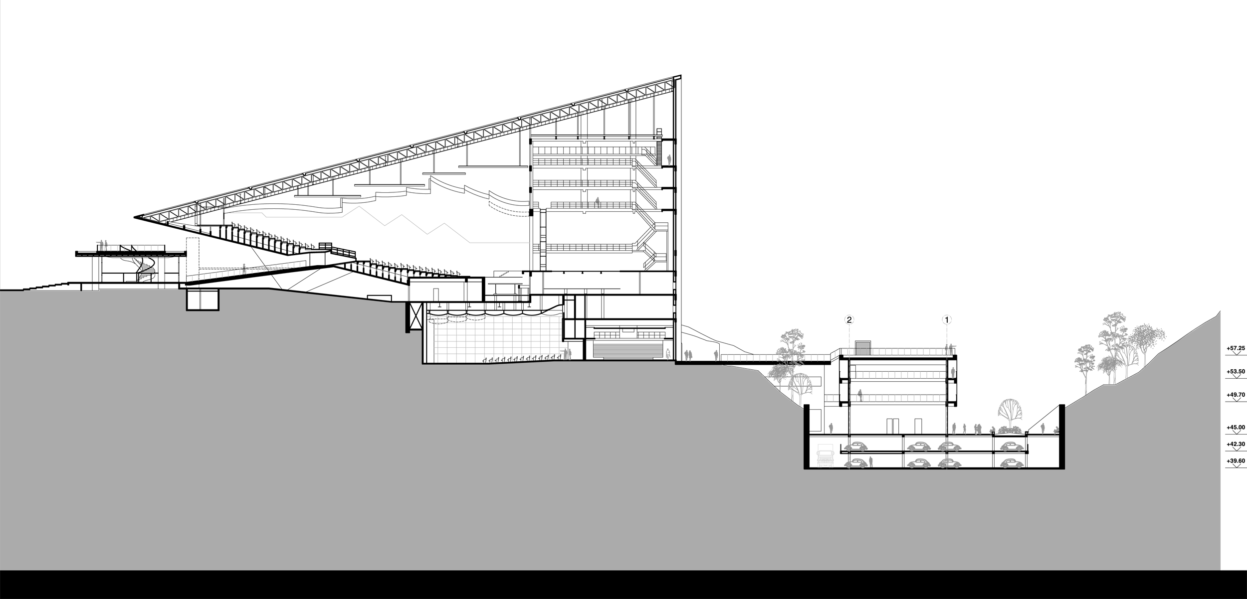 Para permitir a construção dos espaços descritos acima, os fluxos de automóveis e de carga e descarga foram pensados nos subsolos que servem de área de estacionamento. Uma alça ao redor do estacionamento de veículos, com pé-direito duplo, possibilita o trajeto de caminhões até o pátio de carga e descarga que funciona sob a laje do pátio.