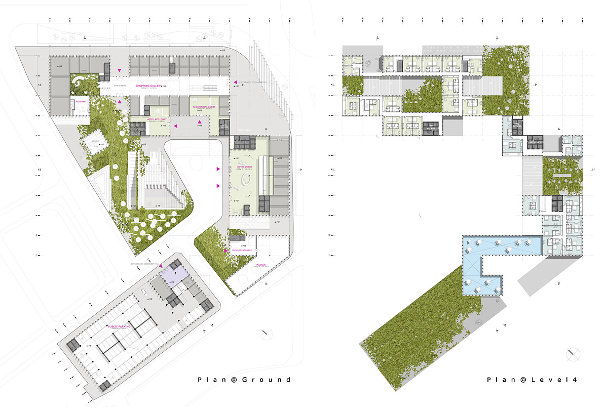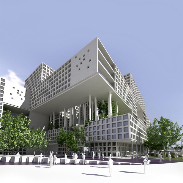 “Oito jardins foram criados no projeto, com características individuais definidas por suas localizações, atividades ou tipos específicos de vegetação. Esses jardins, conectados aos espaços públicos, compõem um passeio público como extensão da cidade, dentro do projeto. A estratégia de conexão entre os jardins e destes em relação à cidade permite uma combinação entre espaços agradáveis e sustentáveis. As aberturas e a permeabilidade do projeto trazem a luz natural e a ventilação para todos os lugares dentro do complexo.”