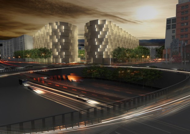 “A fim de alcançar a densidade desejada e atender às exigências do código de edificações e diretrizes urbanísticas, os dois edifícios propostos no projeto são dobrados, gerando volumes em forma de ‘V’, e criando três espaços urbanos triangulares: um mercado, um pátio e um estacionamento na área central. Para atender às demandas dos hóspedes, o hotel foi concebido de dentro para fora. Como resultado, cada elemento em forma de ‘V’ é composto por uma estrutura tipo espinha de peixe, com os quartos voltados para a área sagrada de Iman Reza.”