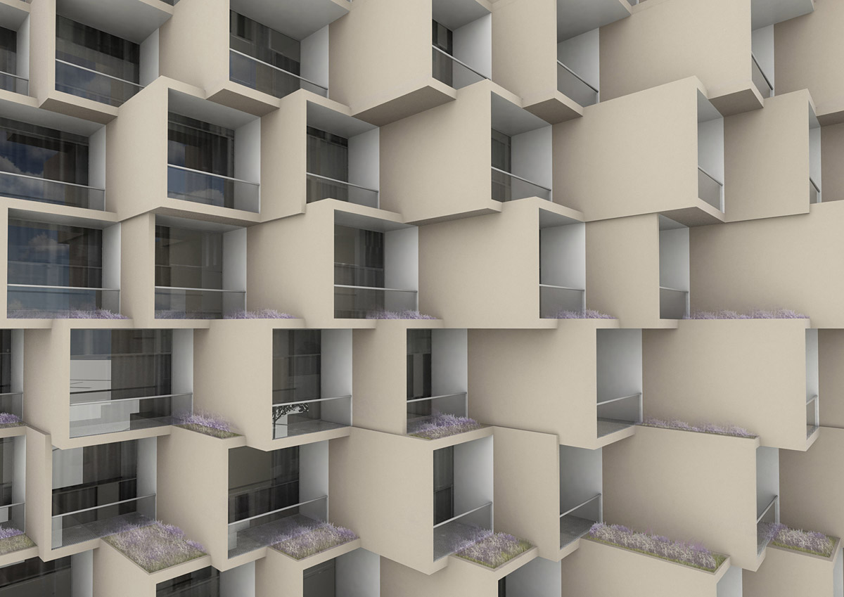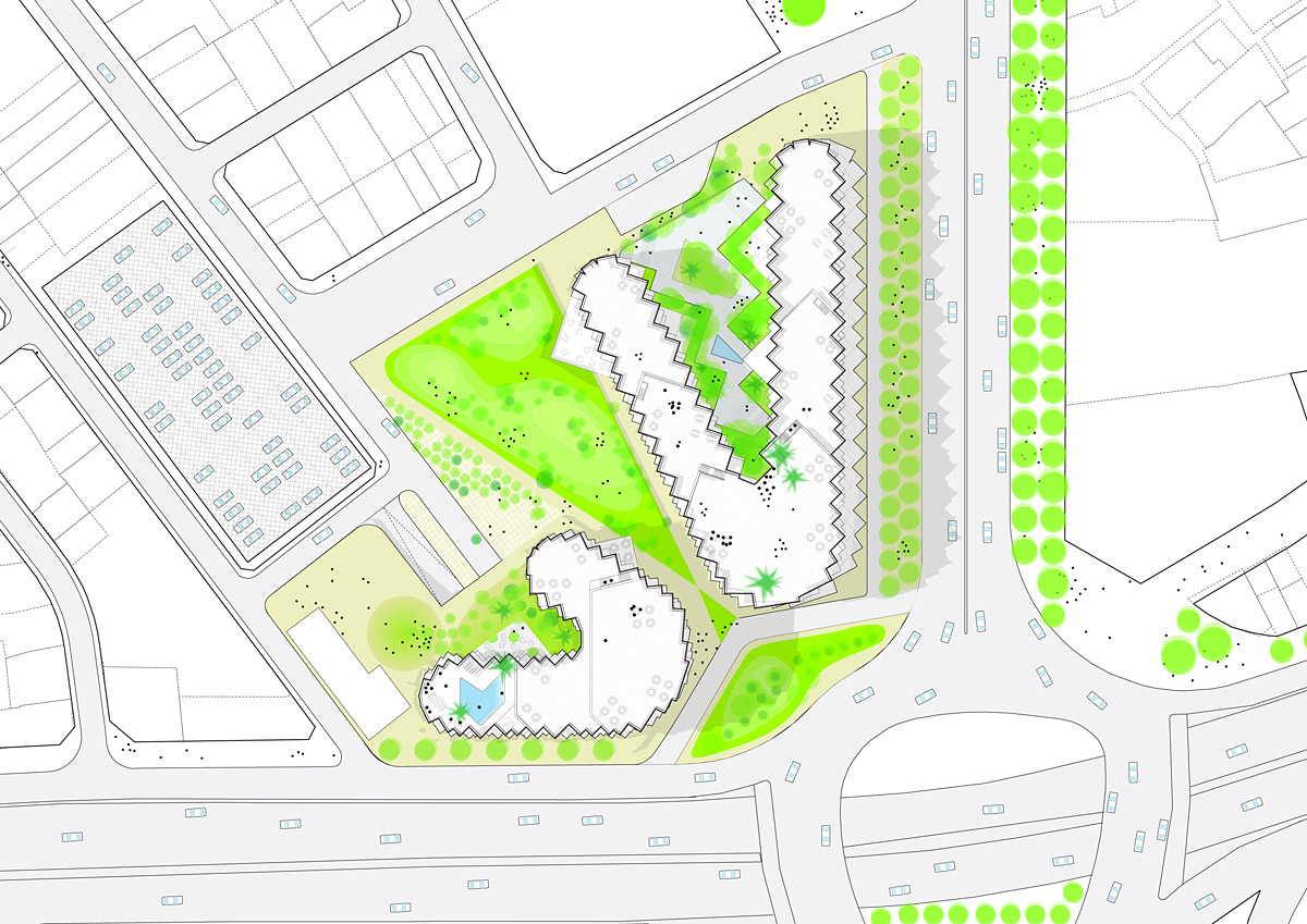 “A fim de alcançar a densidade desejada e atender às exigências do código de edificações e diretrizes urbanísticas, os dois edifícios propostos no projeto são dobrados, gerando volumes em forma de ‘V’, e criando três espaços urbanos triangulares: um mercado, um pátio e um estacionamento na área central. Para atender às demandas dos hóspedes, o hotel foi concebido de dentro para fora. Como resultado, cada elemento em forma de ‘V’ é composto por uma estrutura tipo espinha de peixe, com os quartos voltados para a área sagrada de Iman Reza.”