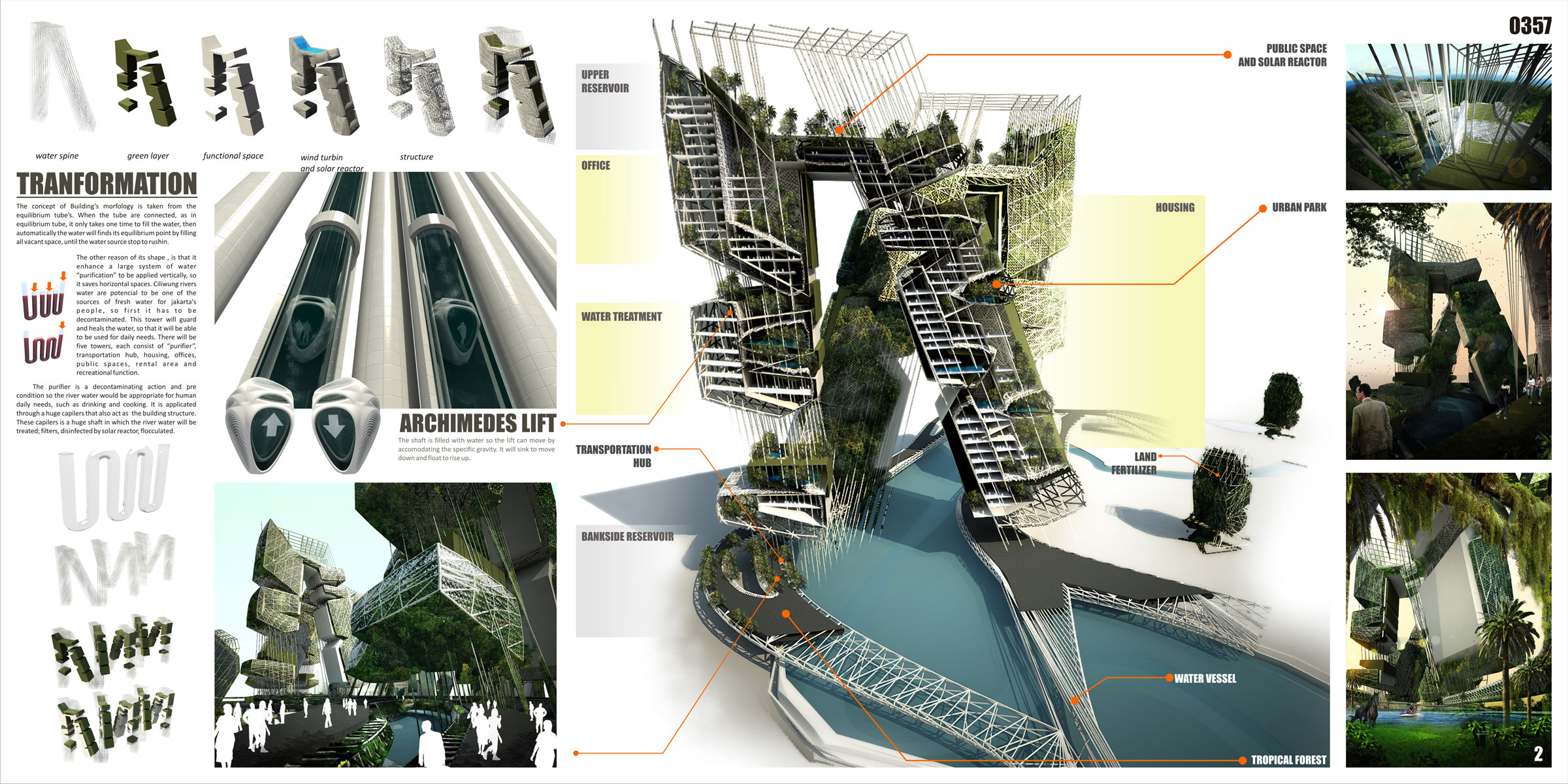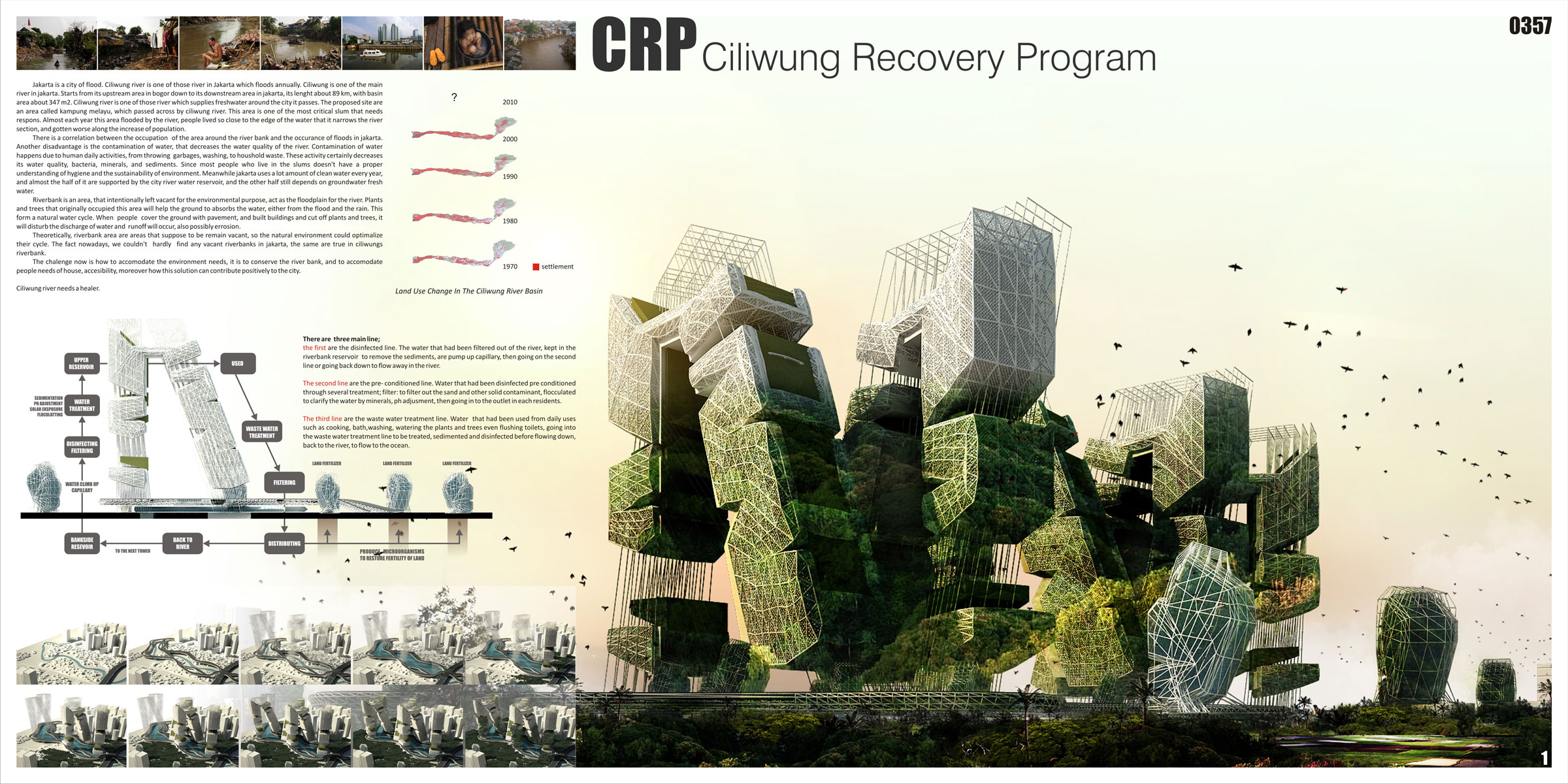 Este projeto, intitulado Programa de Recuperação do Rio Ciliwung, tem como objetivo coletar o lixo das margens do rio e purificar sua água por meio de um sistema engenhoso de filtros em grande escala que irão operar em três fases. A primeira separa os diferentes tipos de lixo, utilizando o lixo orgânico como fertilizante. A segunda fase purifica a água, removendo resíduos químicos perigosos e adicionando minerais importantes. A água limpa, então, retornaria para o rio e para os campos agrícolas circundantes por meio de um sistema de irrigação e abastecimento. Finalmente, na terceira fase, todo o lixo reciclável seria processado.