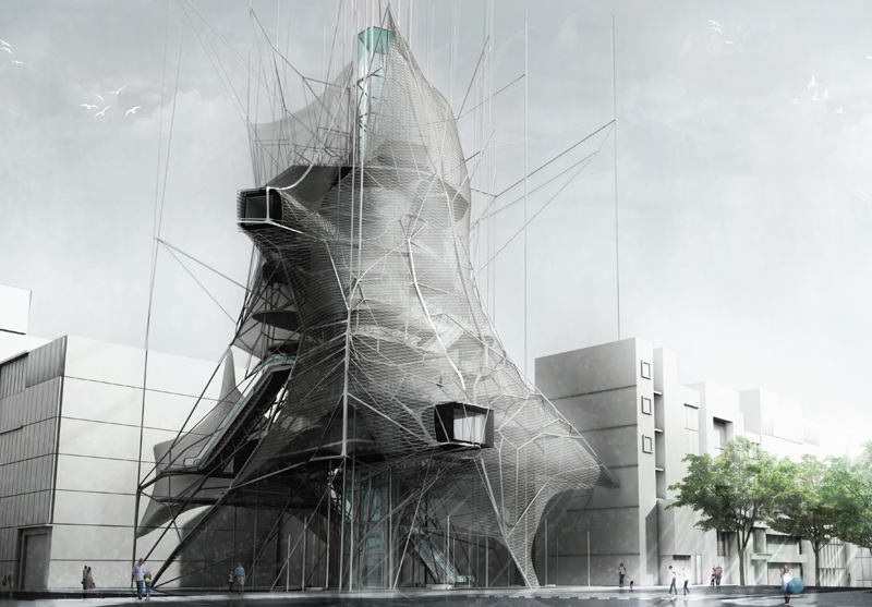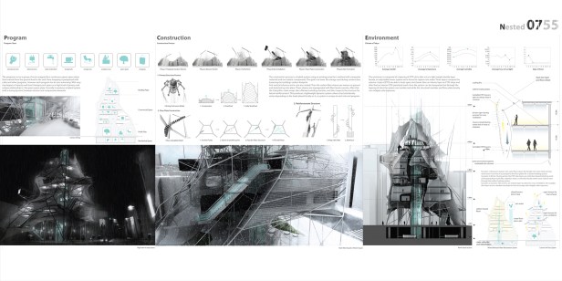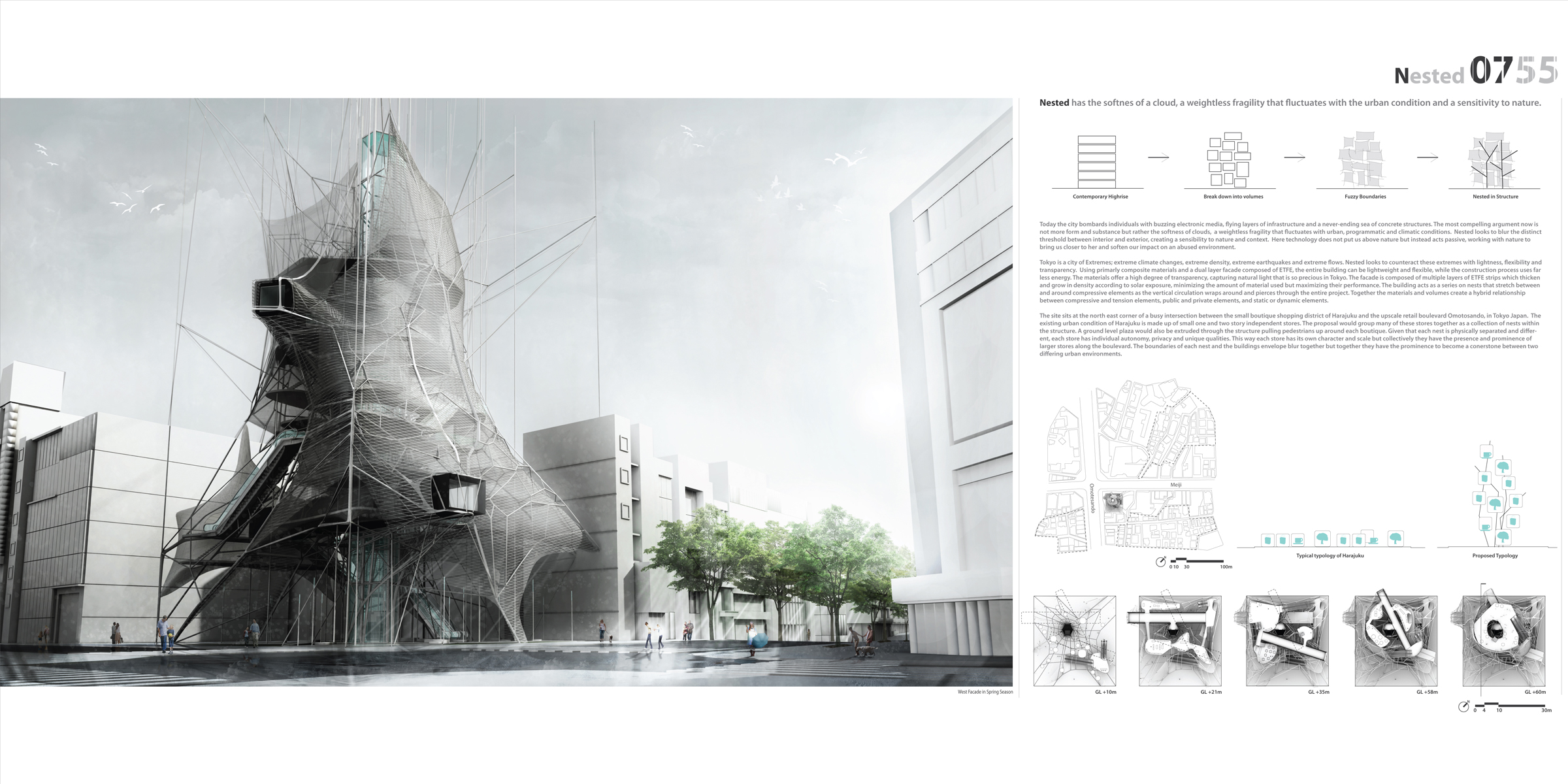 ” Este projeto, intitulado ‘Nested Skyscraper’, se adapta a condições climáticas, urbanas e programáticas com o uso de materiais avançados e construção robotizada. Sua forma e método de construção derivam de soluções de alta tecnologia que combinam aço, concreto a telas em fibras de carbono. O edifício é coberto por múltiplas camadas que se adaptam de acordo com a exposição ao vento e ao sol.