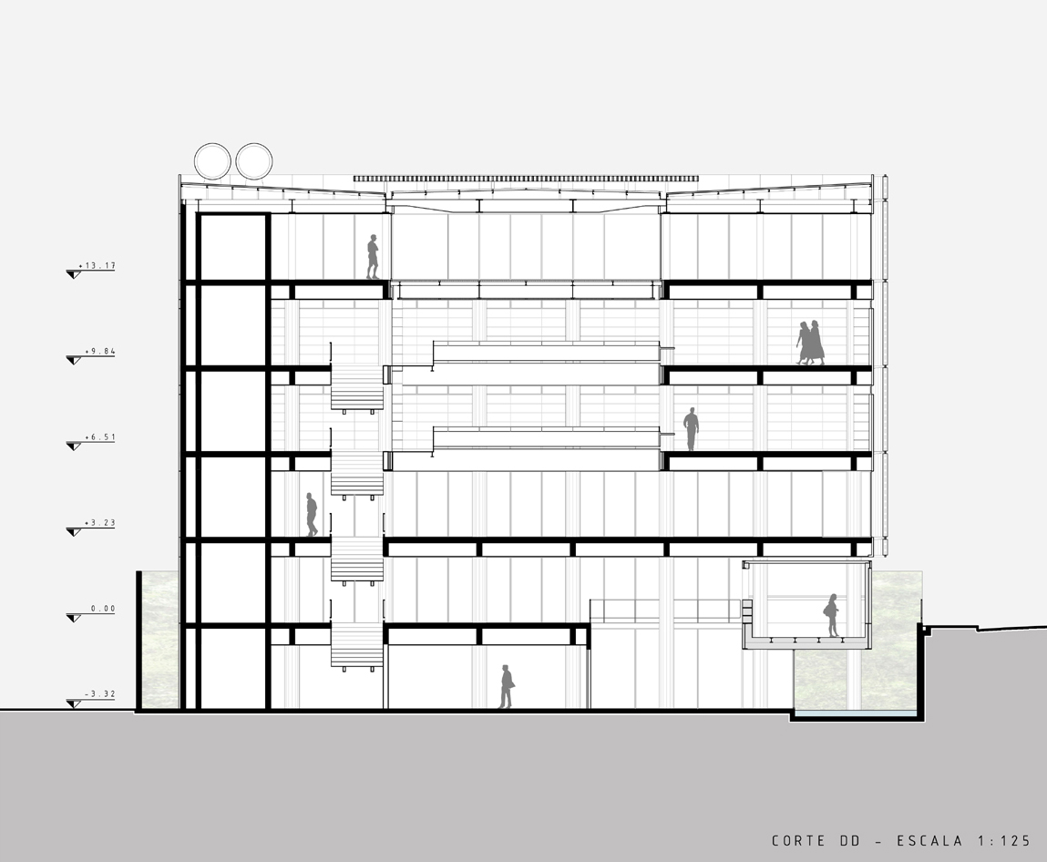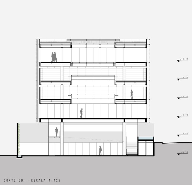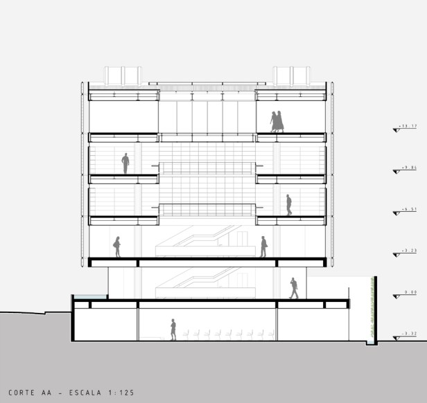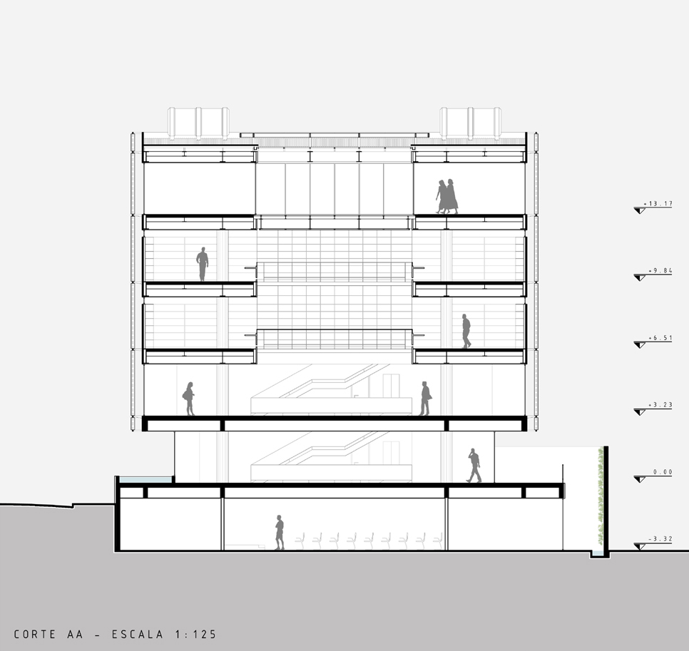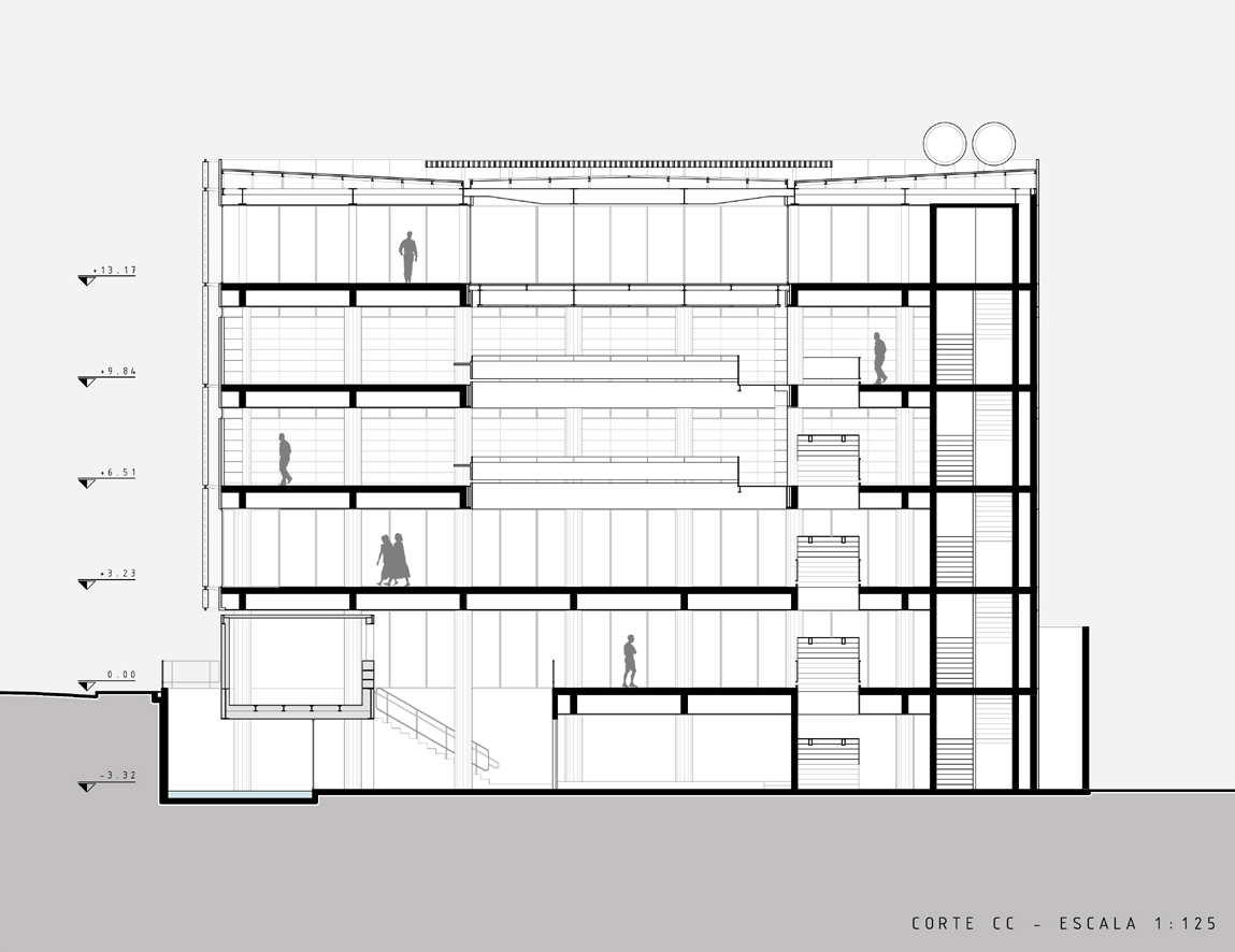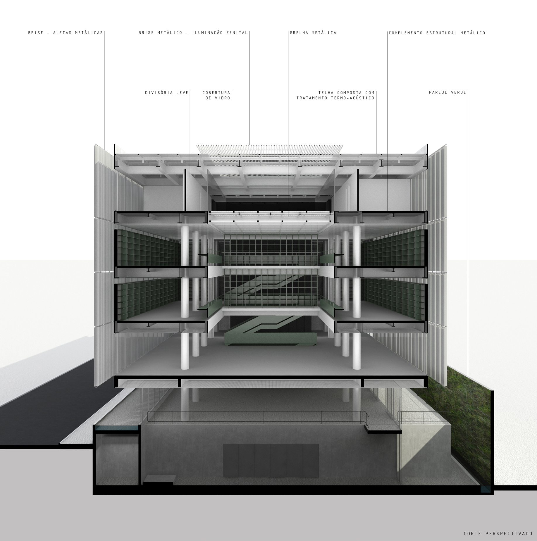 Revela-se então o seguinte partido: externamente o edifício diferencia-se das outras construções da região, enquanto espaço destinado a atividades diferentes dos escritórios e dos prédios comerciais do centro da cidade, através de uma fachada intrigante para quem olha da rua. Internamente o edifício é trabalhado de modo a gerar uma riqueza espacial, utilizando de recursos como os vazios, que dão unidade visual e integram o edifício verticalmente, e iluminação natural, através de aberturas zenitais. Cria-se assim uma diversidade de ambientes; ora generosos, com espaços abertos e pé-direito monumental, ora mais aconchegantes, restritos; ora mais dinâmicos, ora mais calmos…