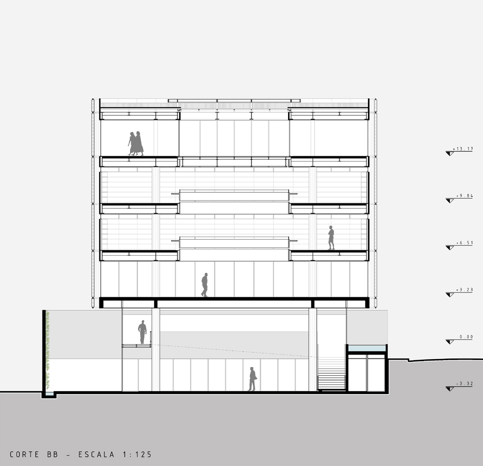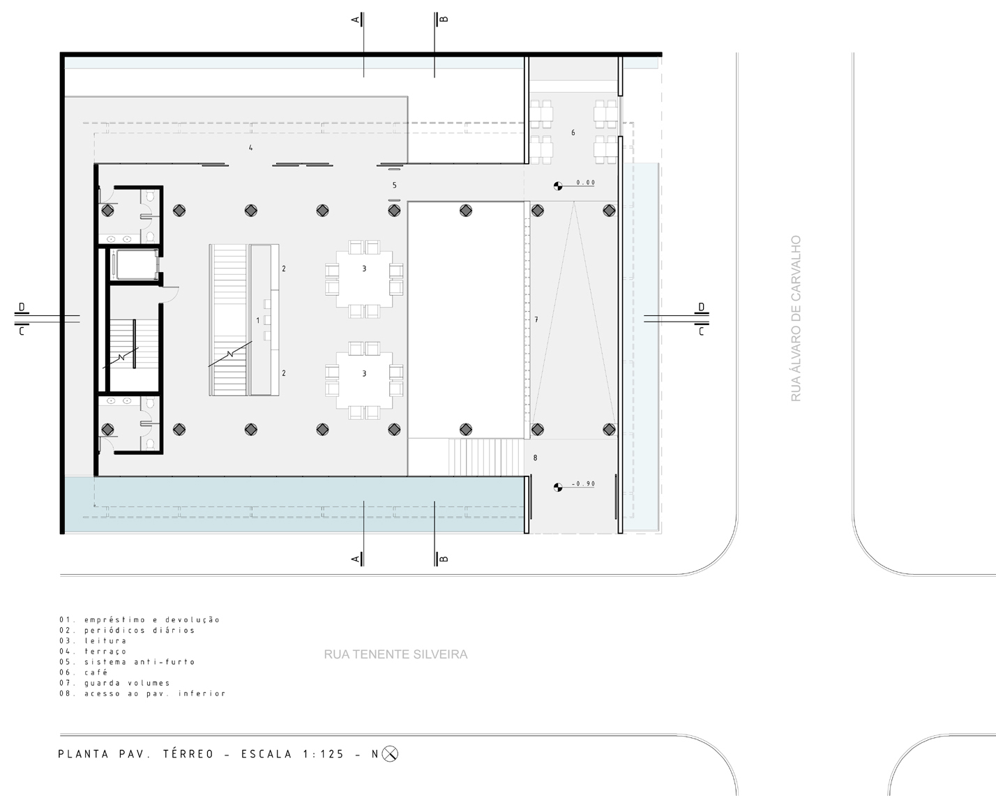 Dentro de uma lógica de setorização, optamos pela divisão do programa em 4 partes distintas, contemplando as seguintes funções âncora: 1 – Acesso / Café / Periódicos Diários / Espaço de Eventos / Auditório – O térreo do edifício funciona como uma transição entre o espaço público por excelência, a rua, e os demais ambientes do edifício. Os fechamentos são feitos em vidro, de modo a não quebrar a permeabilidade visual. Um “túnel” marca o acesso – este leva o pedestre da rua até o interior do edifício, passando por um painel de exposições e com o café ao fundo. Por uma escada pode-se descer para o espaço de eventos e para o auditório; os mesmos também podem ser acessados de forma independente pela Rua Álvaro de Carvalho. Por uma passarela se chega à área fechada da BPSC, logo na entrada está a área dos periódicos, que ocupa um grande salão possuindo também uma área externa. A circulação para os demais andares pode ser feito por meio de elevador ou escada. A escada, em estrutura metálica, dispõe-se de forma solta no espaço, de modo a ficar explícito por onde é feita a circulação entre os pavimentos.
