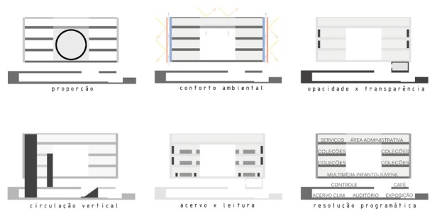 Essa diversidade de espaços e ambientes vem de encontro à necessidade de atender a todas as questões técnicas e funcionais envolvidas em um projeto de biblioteca, dentre os quais: – Correta distribuição dos fluxos e controles de acesso – Distinção dos ambientes conforme: tipo de uso; tipo de apropriação do espaço; dinâmica do uso – Condições de temperatura e umidade adequadas ao acervo – Condições de iluminação e ventilação adequadas às áreas de leitura