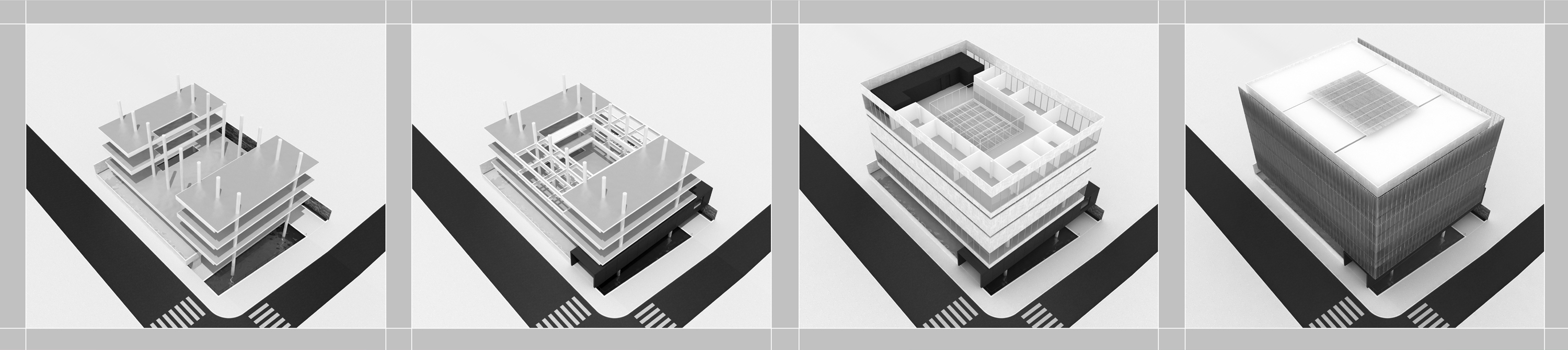 Para alcançar o resultado pretendido no projeto, propõe-se a subtração de alguns trechos da estrutura e a consequente inserção de uma nova estrutura metálica. No térreo ocorre a retirada de dois módulos da estrutura original, gerando um espaço continuo entre o térreo e o pavimento inferior. Para possibilitar o vazio central no 2° e 3° pavimentos foram subtraídos três módulos da estrutura em cada andar, as vigas e lajes são substituídas e a estrutura nova trava a movimentação horizontal da estrutura existente. A antiga laje de cobertura do edifício receberá um reforço estrutural para poder abrigar o 4º pavimento. A cobertura projetada para esse andar é composta por uma estrutura metálica leve e utiliza telha composta com tratamento termo-acústico.