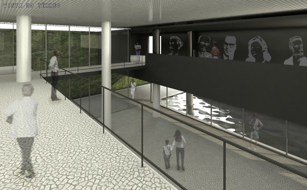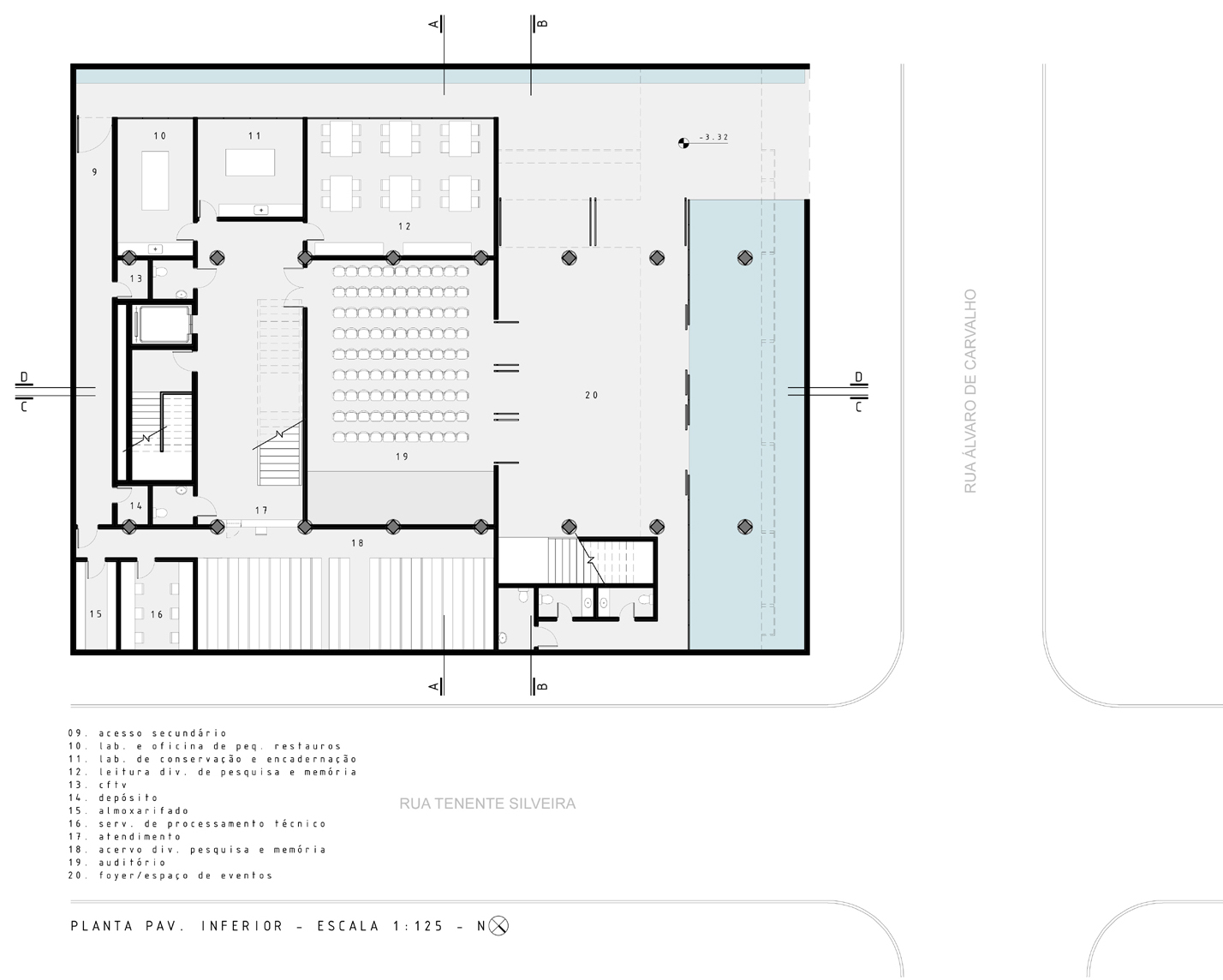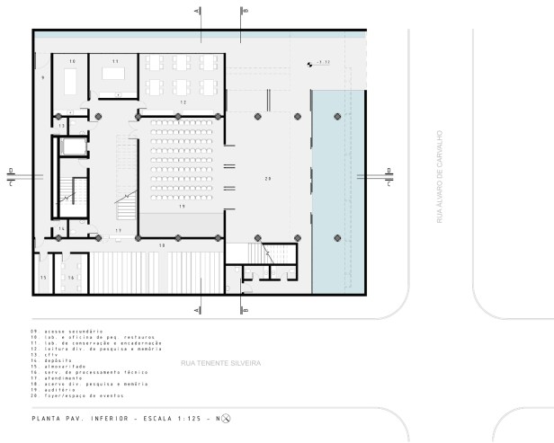 2 – Divisão de Pesquisa e Memória – Situa-se no pavimento inferior do edifício e é acessada pelo usuário através da circulação interna da biblioteca. O acervo está em local reservado, com controle severo de temperatura e umidade do ar – o mesmo está diretamente ligado ao acesso secundário. As áreas de leitura e os laboratórios estão em local privilegiado e voltam-se para a parede jardim, recebendo iluminação natural.