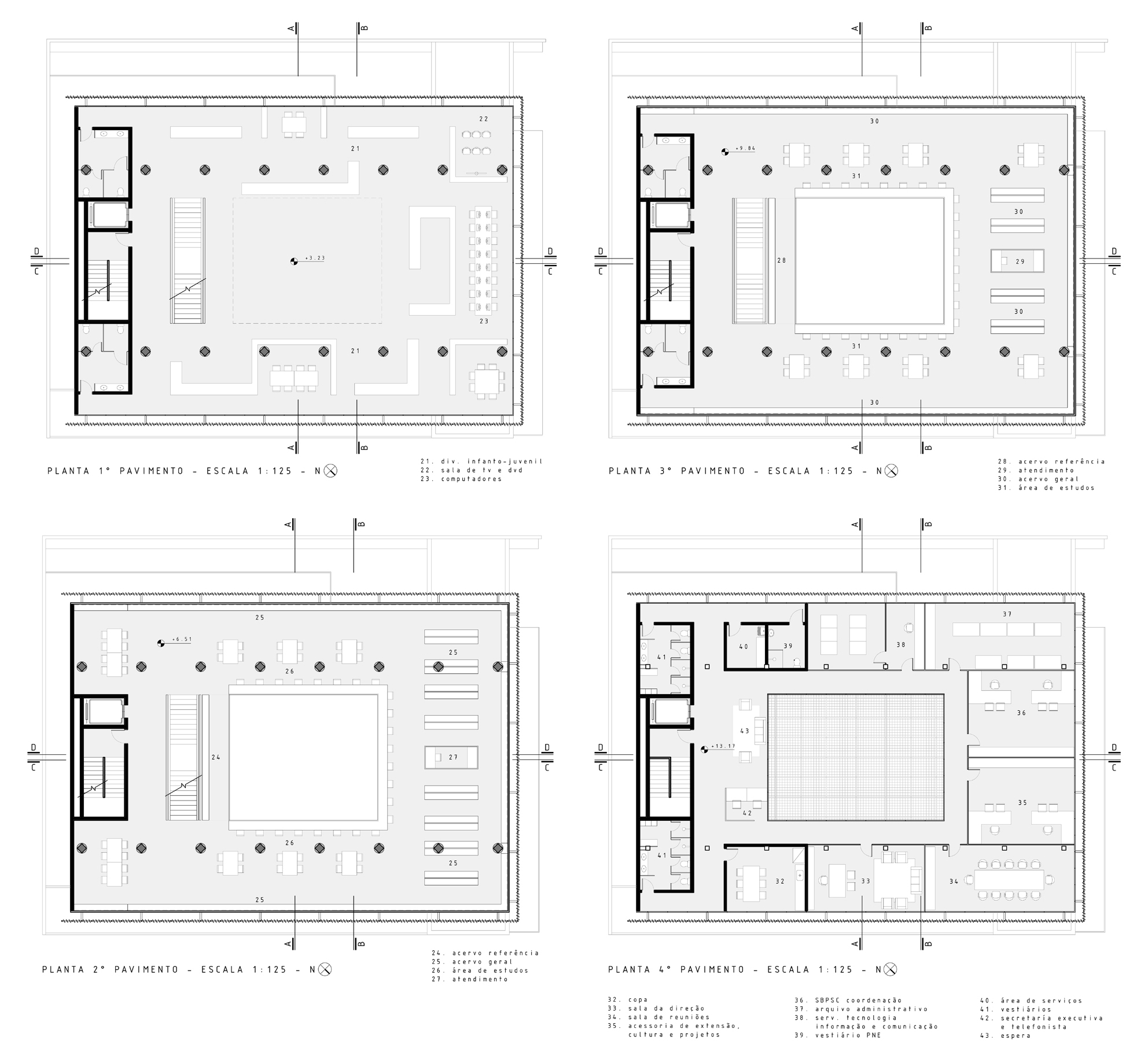 3 – Divisão Infanto-Juvenil / Serviço de Multimídia e Internet / Divisão de Atendimento ao Usuário – Configura-se como um espaço para receber a maior concentração de freqüentadores da BPSC, ocupando o 1º, 2º e 3º pavimentos. No 1º pavimento, com fechamentos em vidro e maior luminosidade dispõe-se a divisão infanto-juvenil e o serviço multimídia e internet. O layout é definido pelo desenho livre das estantes, com 1,20m de altura, criando um ambiente lúdico e dinâmico. No 2º e 3º pavimentos, ocupados pela divisão de atendimento ao usuário, o fechamento das fachadas é opaco, protegendo o acervo da radiação solar direta. As estantes dispõem-se de forma linear ao longo das paredes periféricas, formando um grande “salão de livros” ao redor do vazio central, que integra os três pavimentos e permite a entrada de luz zenital.