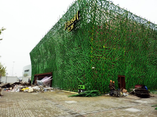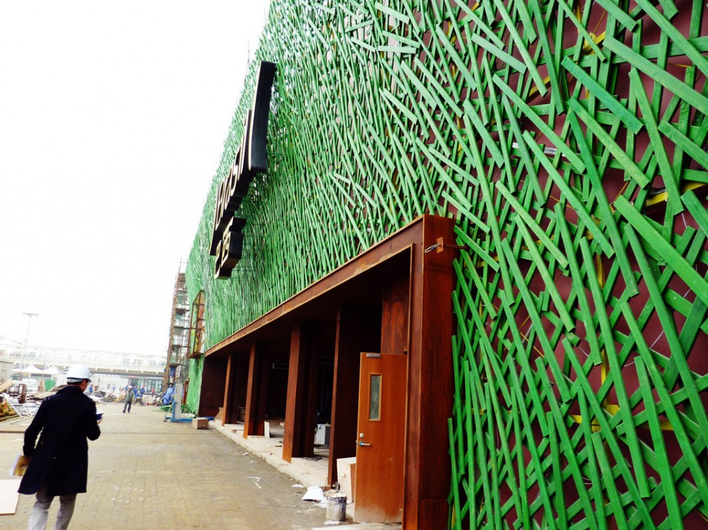 ‘… Uma pele verde, em forma de “parêntesis”, cobre o exterior do pavilhão. Esta pele é feita da reutilização de madeira usada, fixada a uma malha de aço na fachada. Isso é a “Brasilidade” do design brasileiro…’