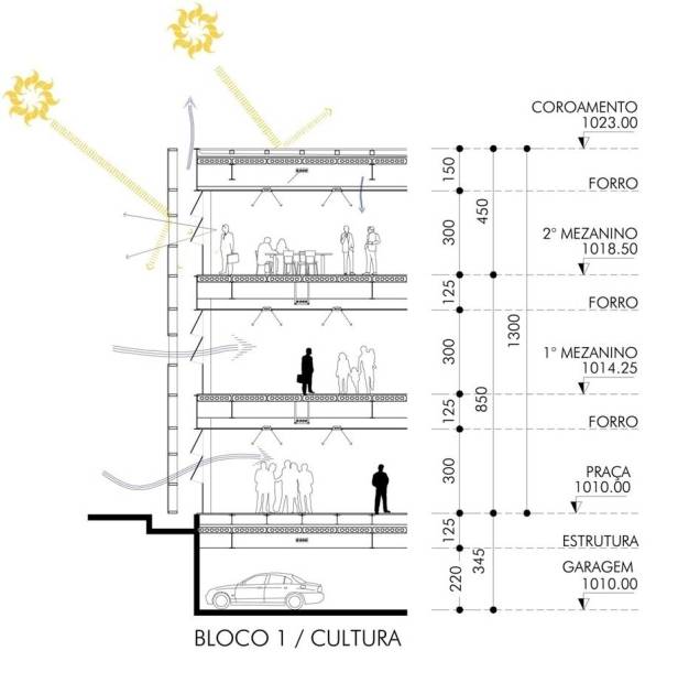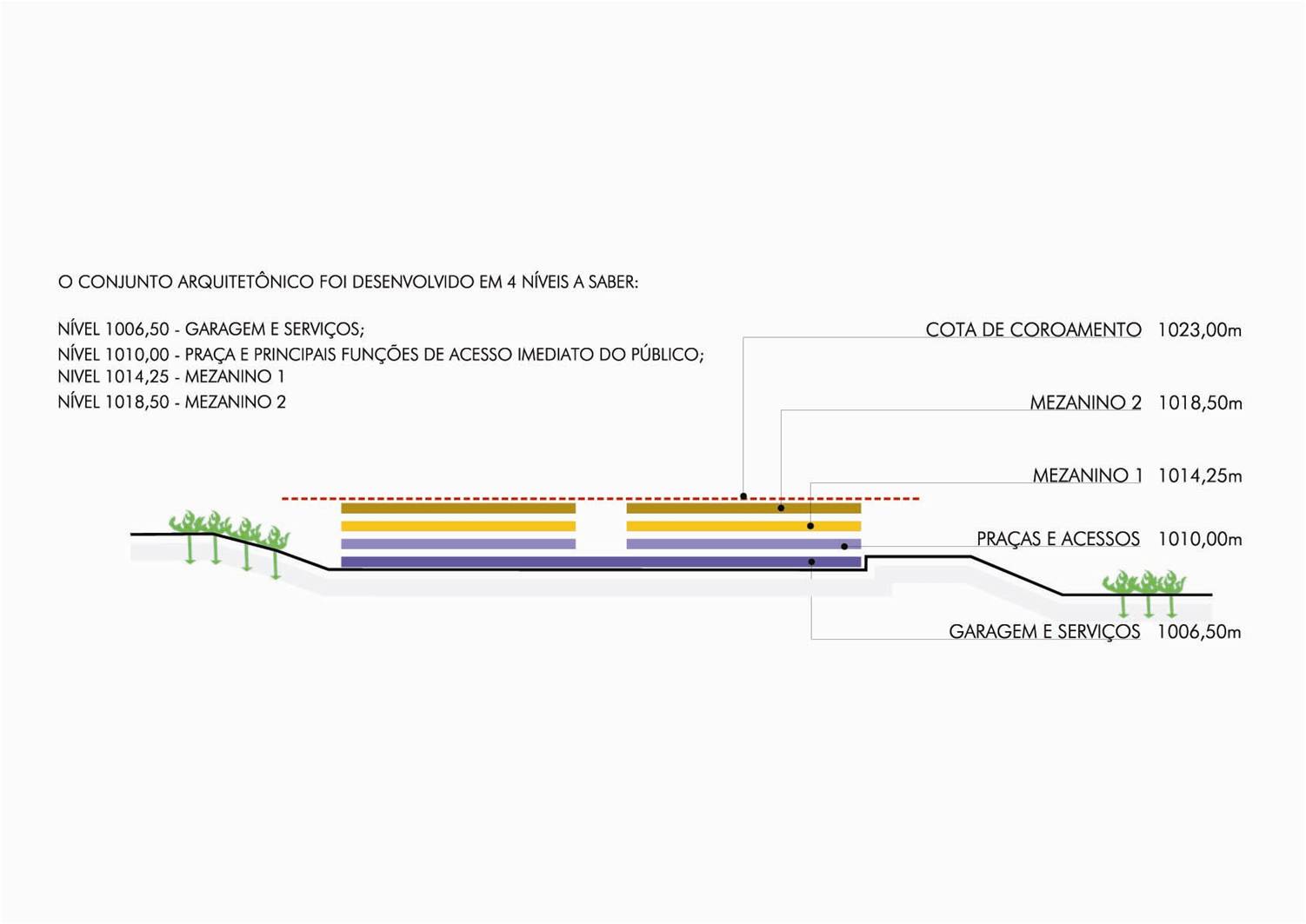 No nível da praça de acesso estão posicionadas as funções que mais exigem o contato direto com os usuários e os espaços destinados a maior concentração de público, como no caso, os teatros;