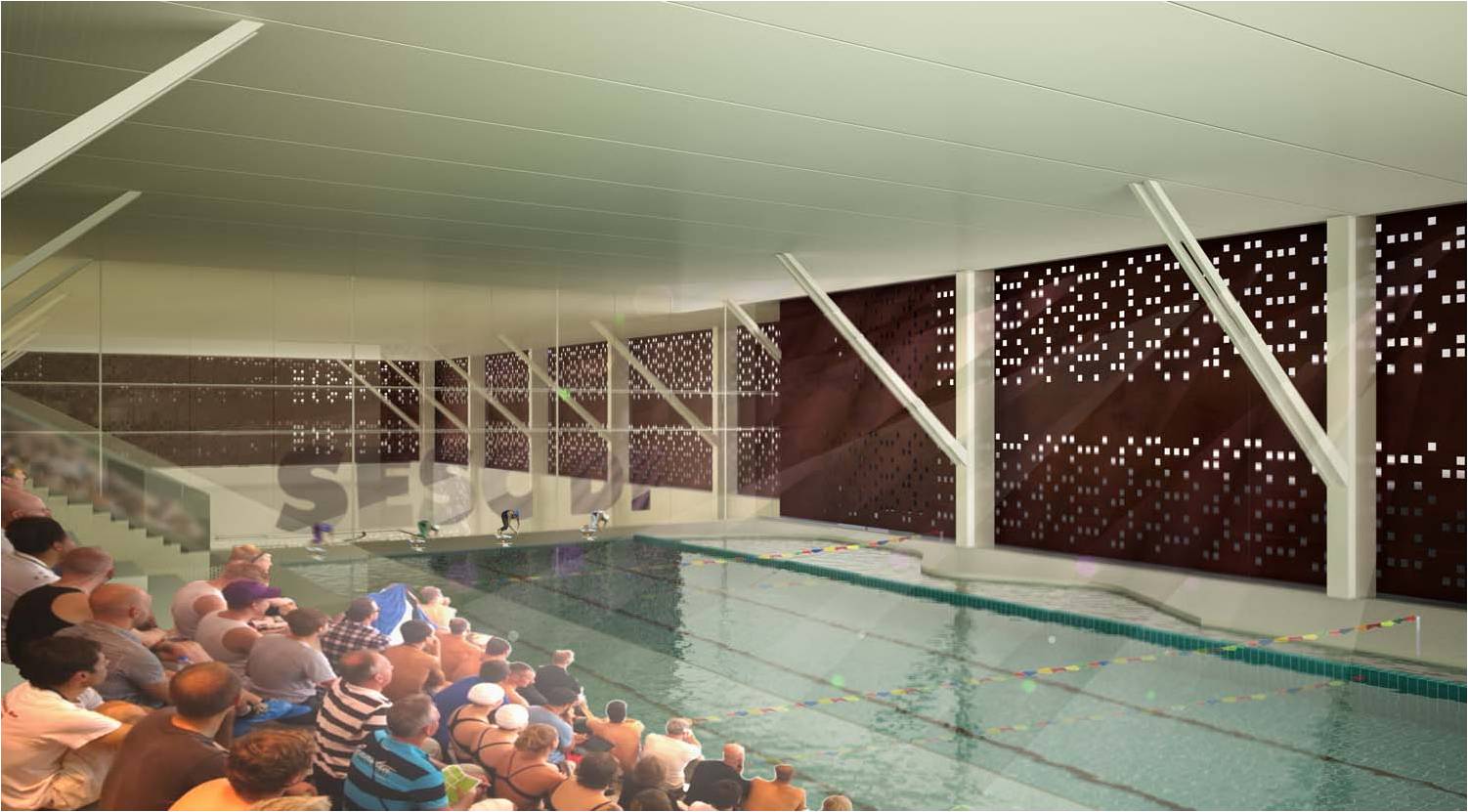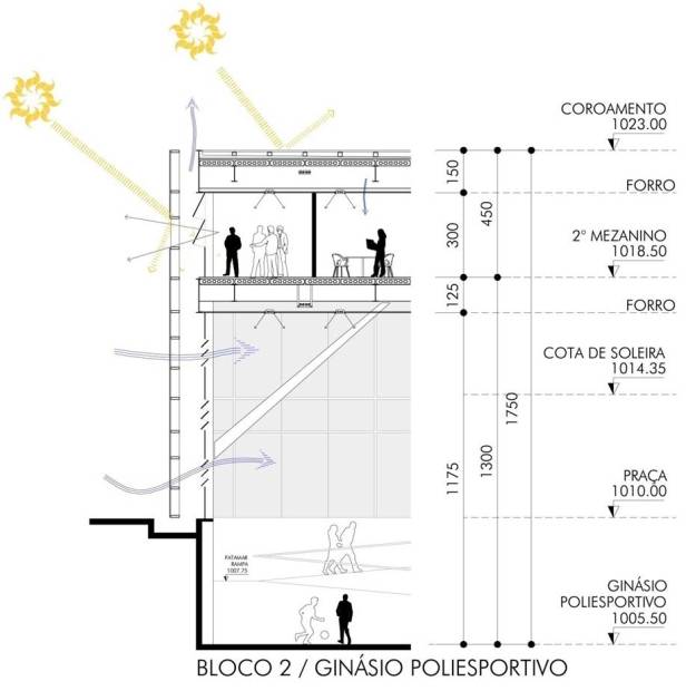 No nível do mezanino 2 estão situadas as áreas esportivas complementares no bloco 2 e no bloco 3 estão situados o restaurante e o salão de festas. Desta forma, os espaços que abrigam atividades mais duradouras possibilitam uma maior visão do conjunto arquitetônico e da paisagem urbana do local;