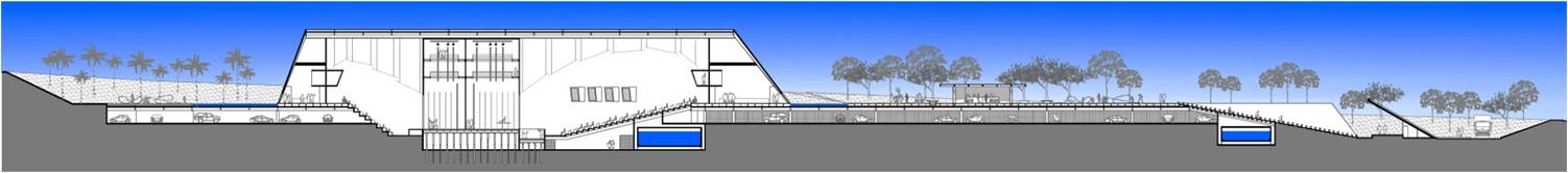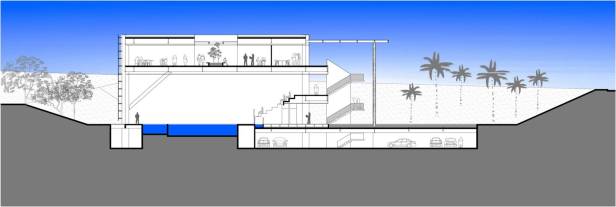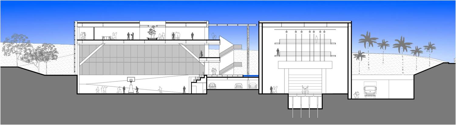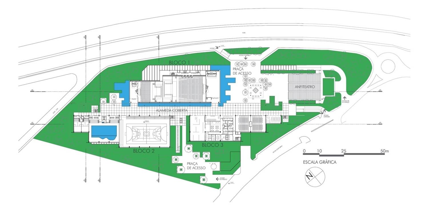 Os três blocos propostos, denominados bloco 1, bloco 2 e bloco 3, se interligam espacialmente no pavimento térreo, dando total flexibilidade de acesso aos usuários neste nível. O bloco que abriga as atividades culturais e gerenciais /logística e o bloco de esportes também se interligam nos níveis dos mezaninos 1 e 2 através de passarela, da qual é possível sempre desfrutar da imagem da praça, do lago e da ponte dos arcos.