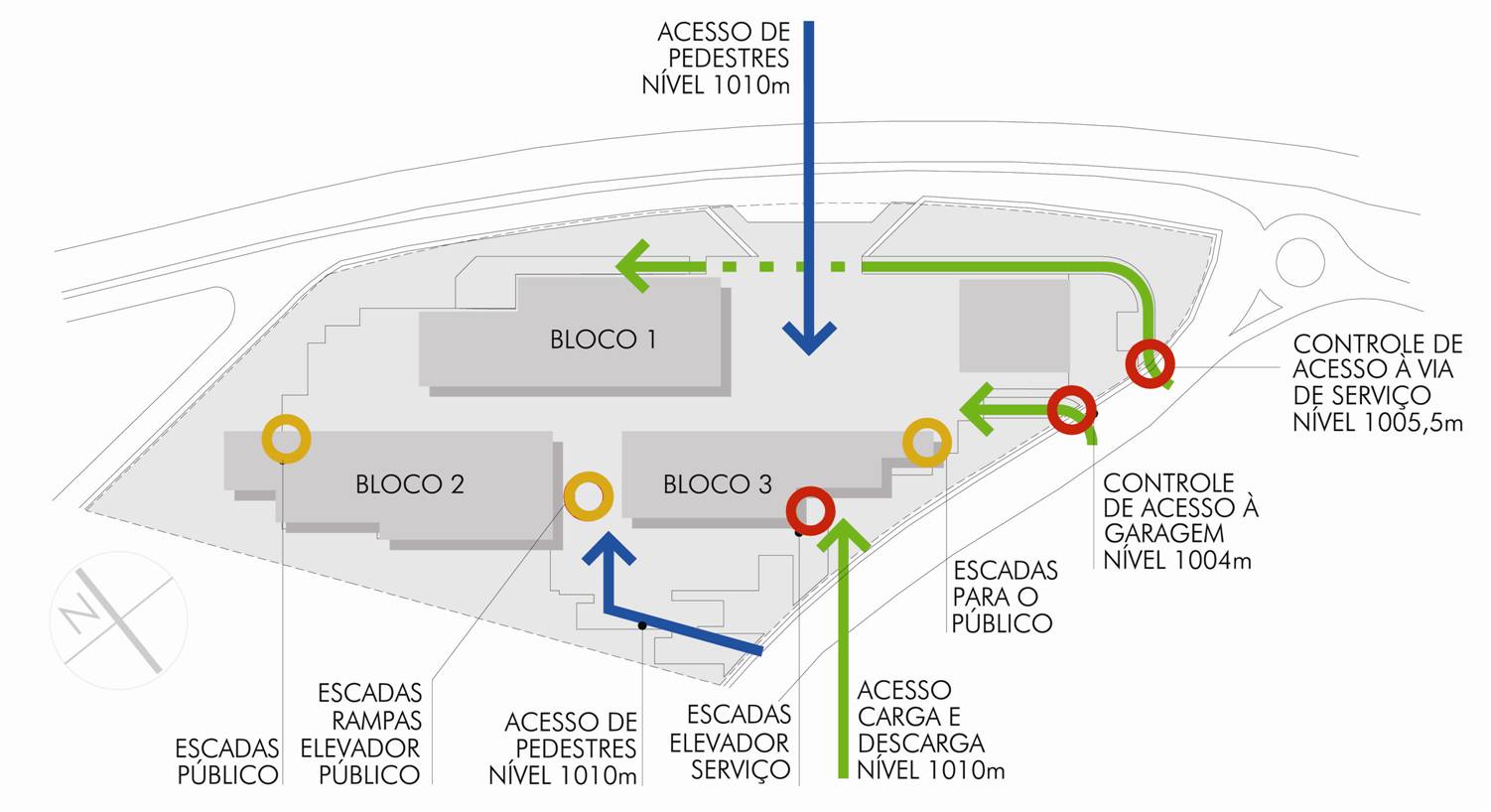 Os acessos são claros e facilmente controlados. Uma via de serviço corta o lado nordeste do terreno. Este acesso atende tanto aos auditórios como a central de utilidades. O acesso veicular controlado da garagem é feito a partir de um eixo, do qual se distribui o fluxo interno.