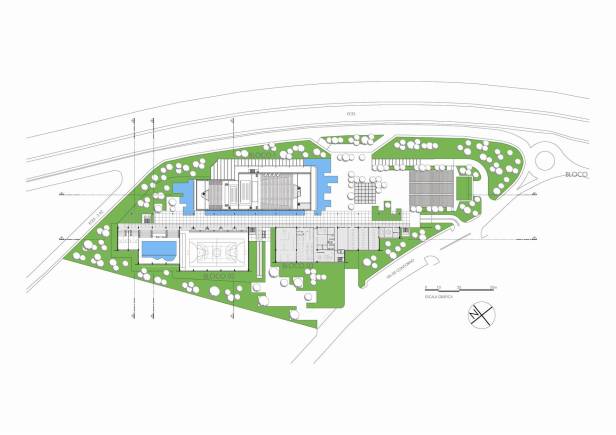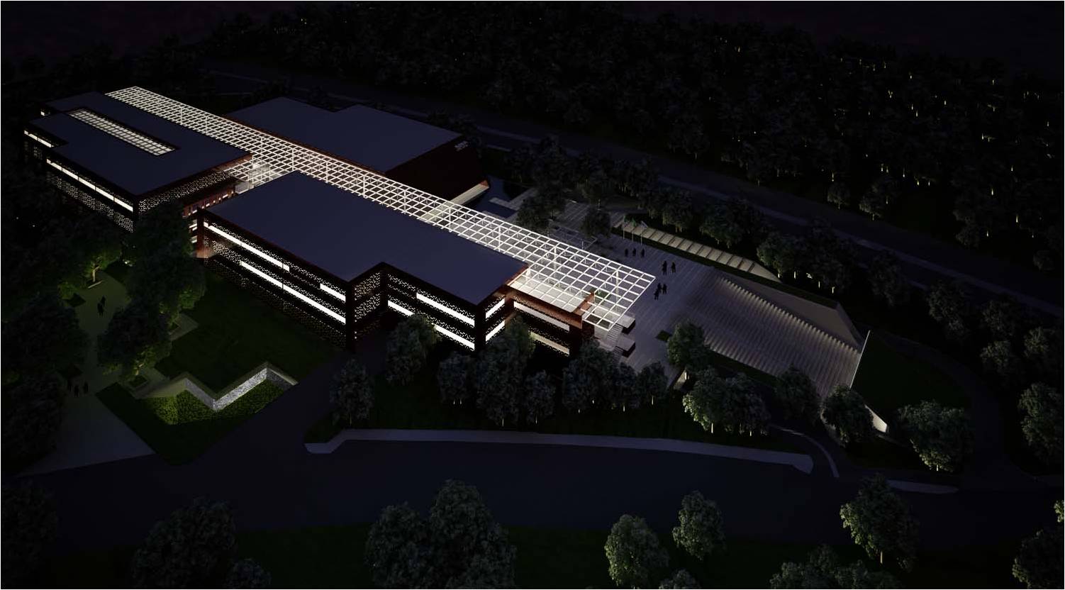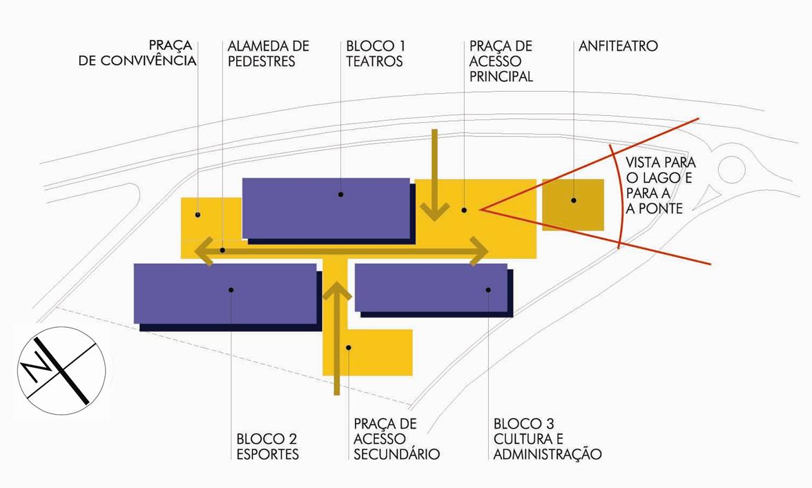 Os três blocos abrigam as necessidades do programa: o bloco 1 abriga o conjunto de teatros, no bloco 2 se encontram as atividades esportivas e no bloco 3 estão as atividades culturais e gerenciais/logística. Estes blocos se relacionam harmônicamente entre si e mostram cada um seu caráter. Eles serão implantados sobre uma esplanada caracterizada por duas praças de recebimento das pessoas ao complexo, marcando a intenção do desenho da arquitetura.