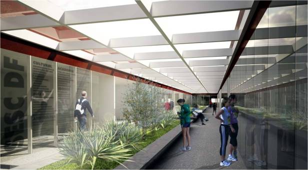 Estas praças se comunicam através de uma alameda de pedestres que, protegida das intempéries, é eixo estruturante do conjunto arquitetônico. Através deste eixo se permeia toda o conjunto edificado e demais equipamentos, sendo um gesto fundamental no partido adotado.