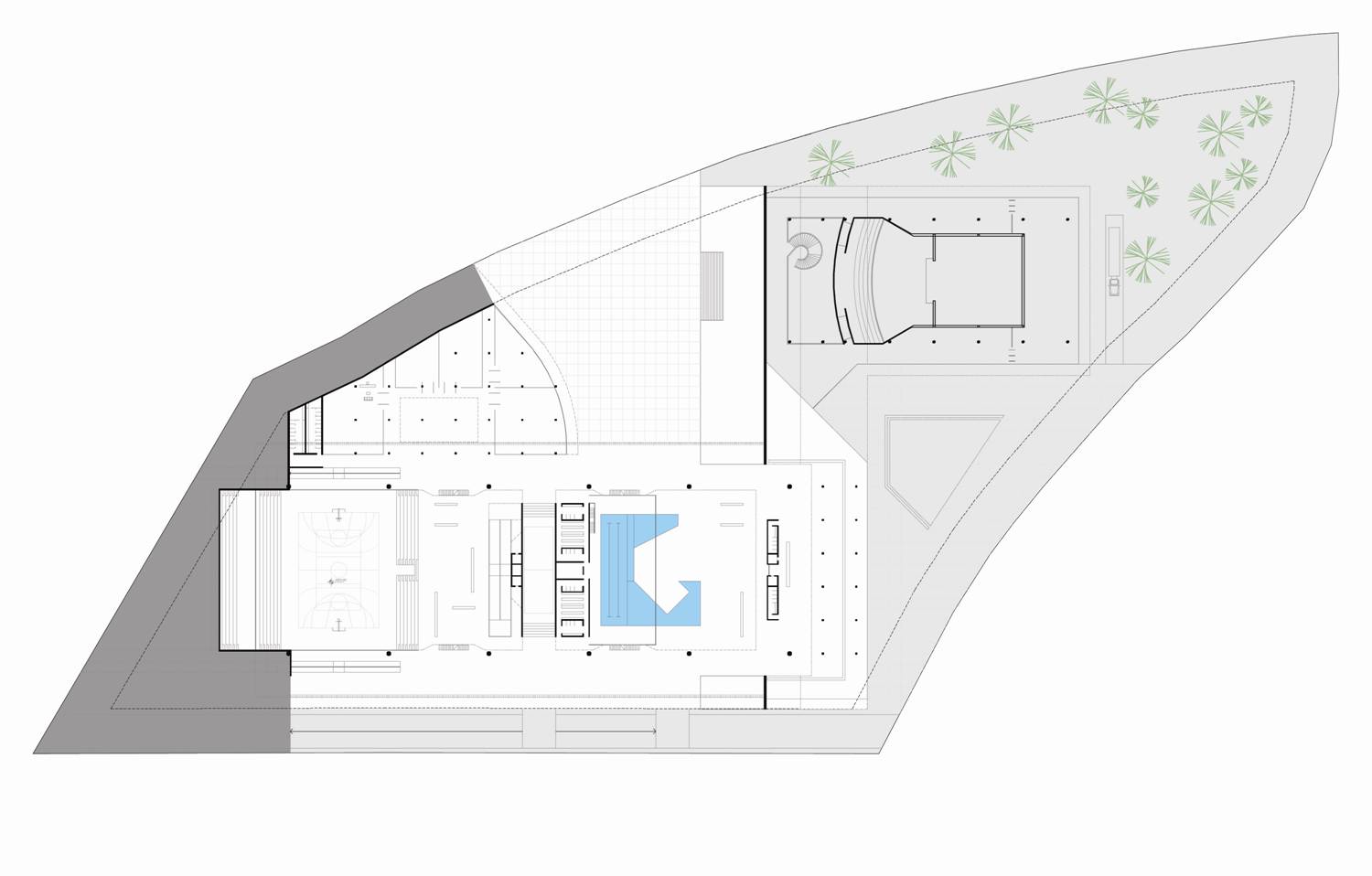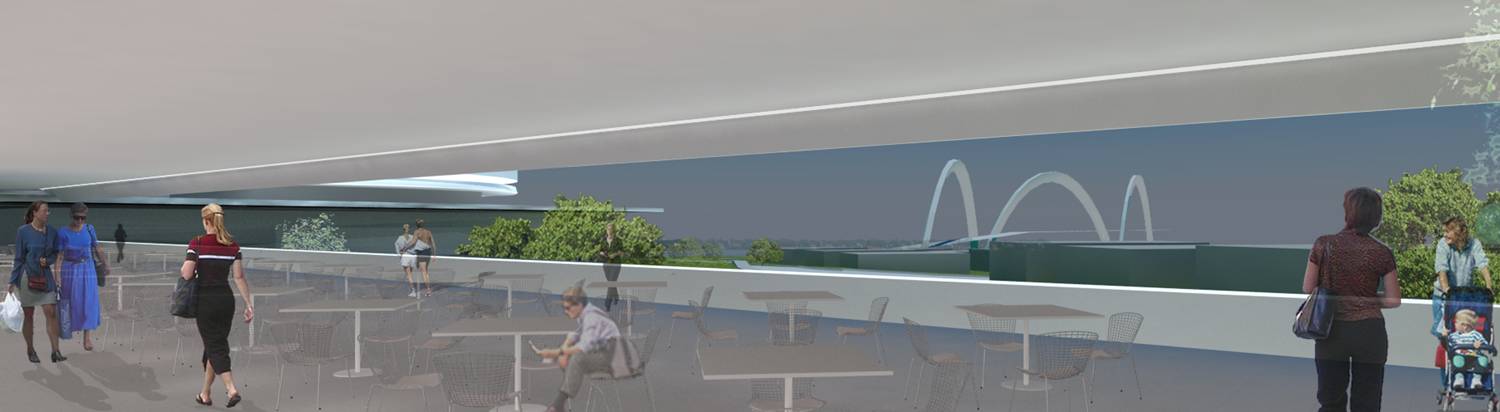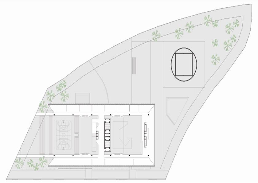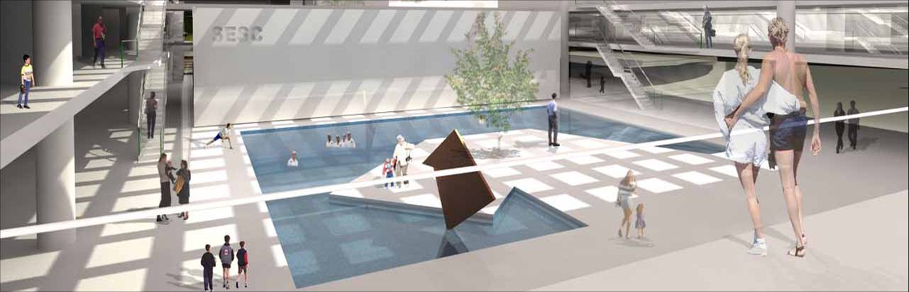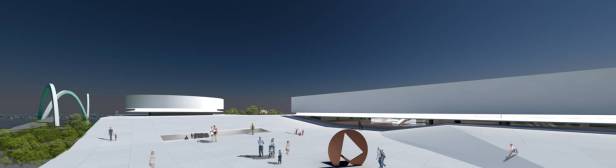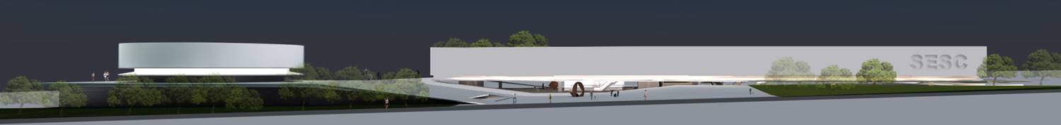 Fizemos uma grande praça com o teatro, com grandes átrios internos iluminados: um complexo com espaços de agradável micro-clima permeável. São plataformas de encontro, extensão dos níveis da edificação ligadas às cotas da paisagem natural. A praça externa maior, o grande teatro de arena com os planos de pequena declividade se volta ao grande palco, apresentação de shows ao ar livre. A praça do artista na ala cultural esta envolta pelo restaurante e o grande espelho dágua, versão interessante do conjunto aquático. A praça do atleta que se estende ao entretenimento das crianças e da terceira idade. São grandes planos de estar e convivência, pontos que se interligam na ampla horizontalidade: pontos de confluência. O encontro é natural, individual ou coletivo e desta forma acolhe de maneira espontânea o cidadão que permeia a edificação.