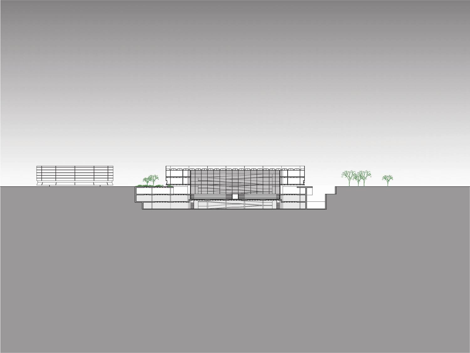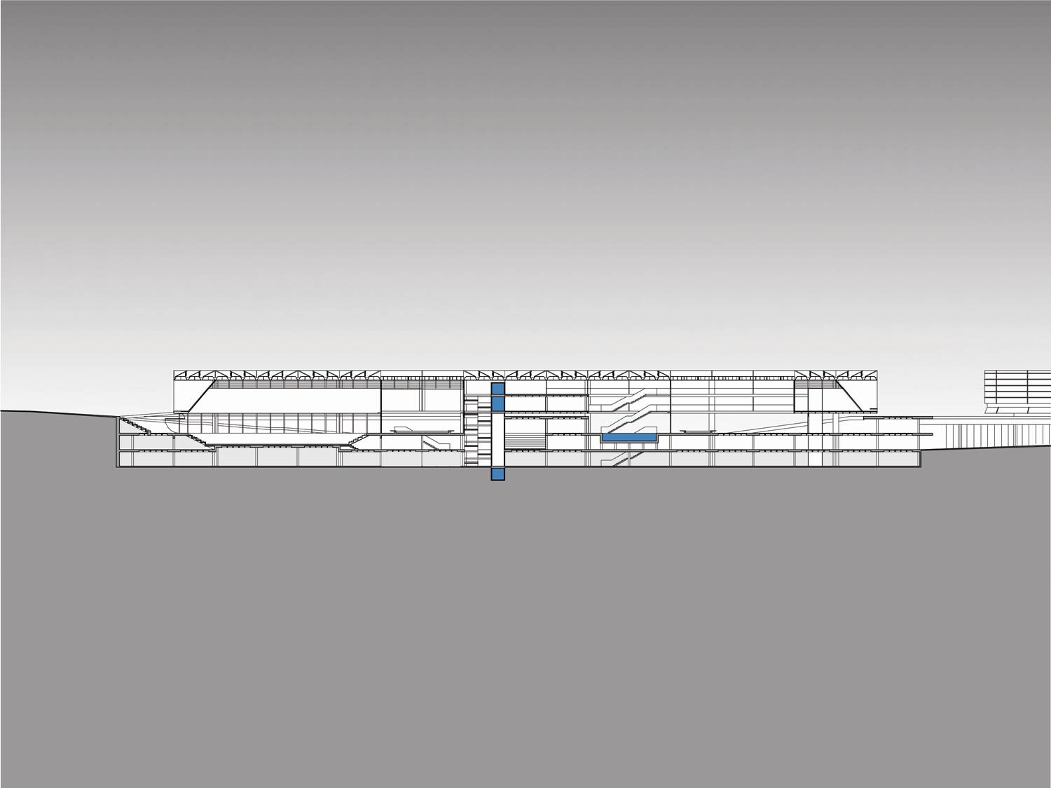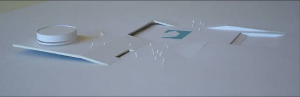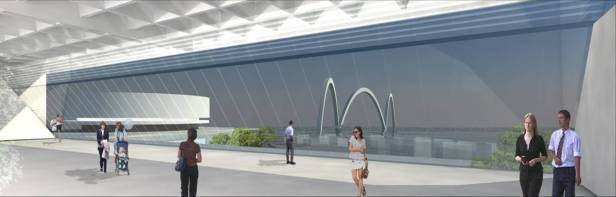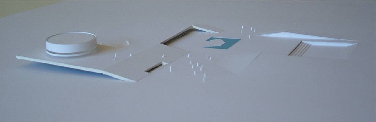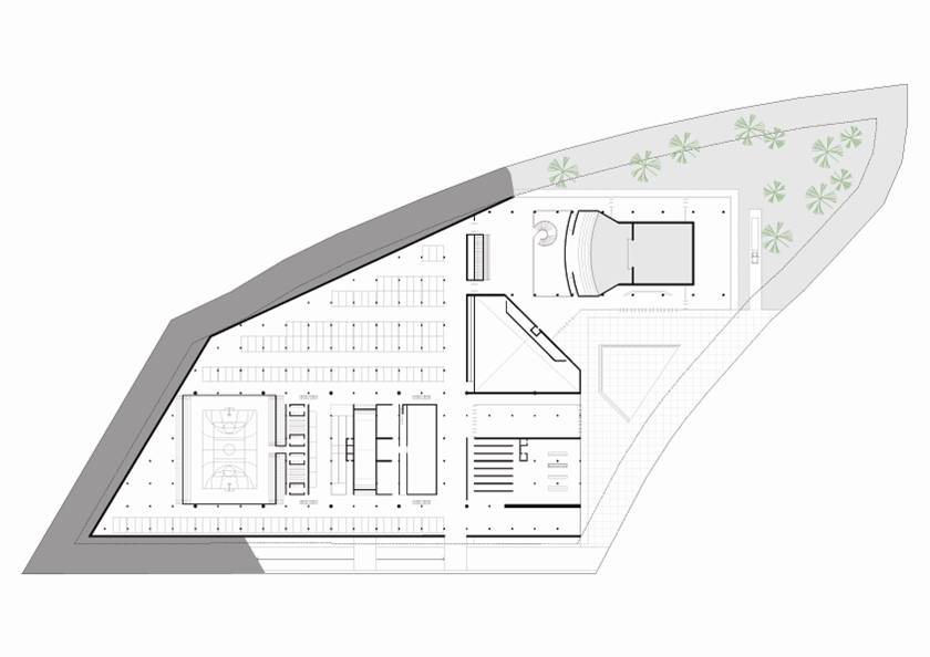 Fizemos uma grande praça com o teatro, com grandes átrios internos iluminados: um complexo com espaços de agradável micro-clima permeável. São plataformas de encontro, extensão dos níveis da edificação ligadas às cotas da paisagem natural. A praça externa maior, o grande teatro de arena com os planos de pequena declividade se volta ao grande palco, apresentação de shows ao ar livre. A praça do artista na ala cultural esta envolta pelo restaurante e o grande espelho dágua, versão interessante do conjunto aquático. A praça do atleta que se estende ao entretenimento das crianças e da terceira idade. São grandes planos de estar e convivência, pontos que se interligam na ampla horizontalidade: pontos de confluência. O encontro é natural, individual ou coletivo e desta forma acolhe de maneira espontânea o cidadão que permeia a edificação.