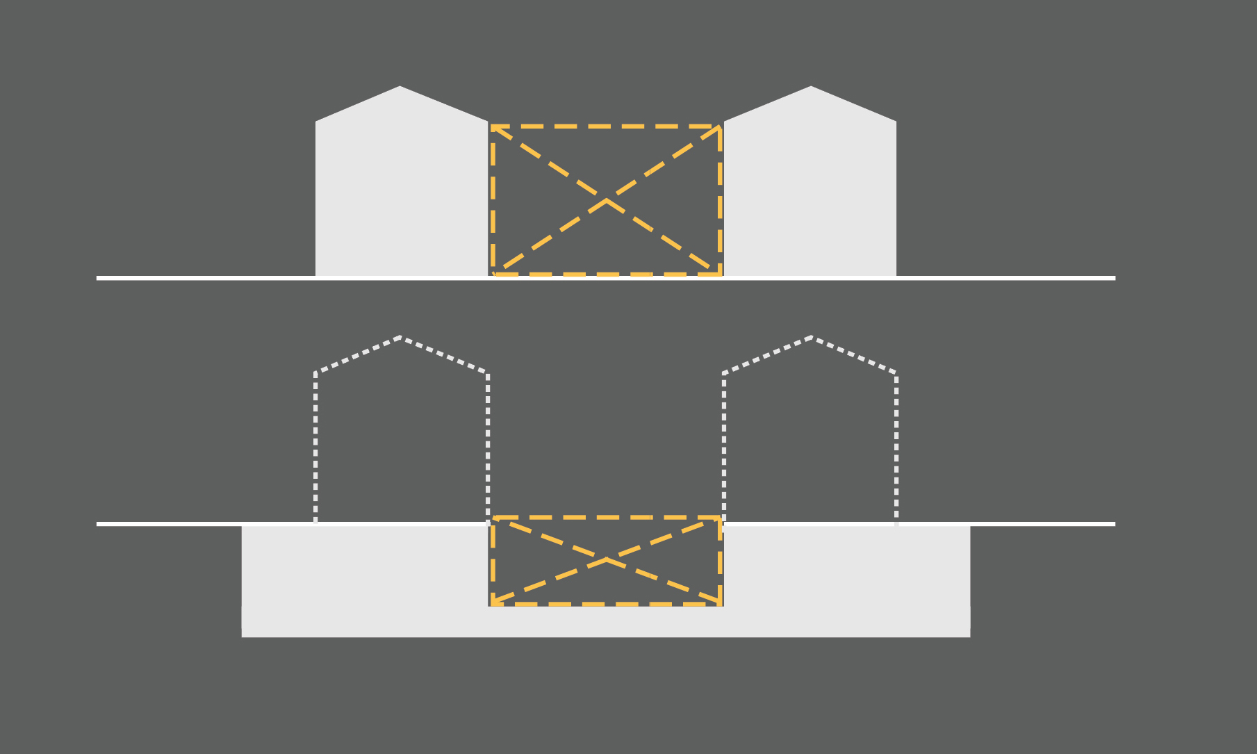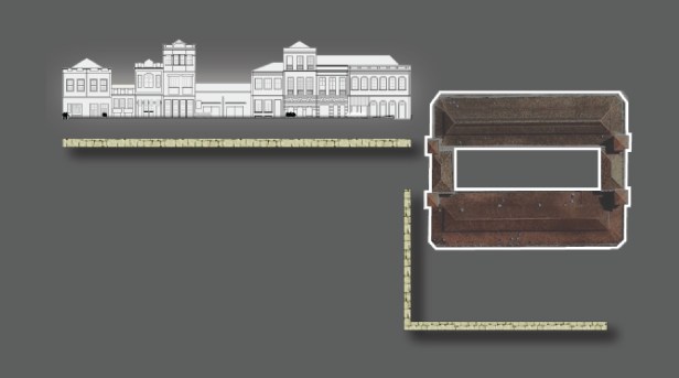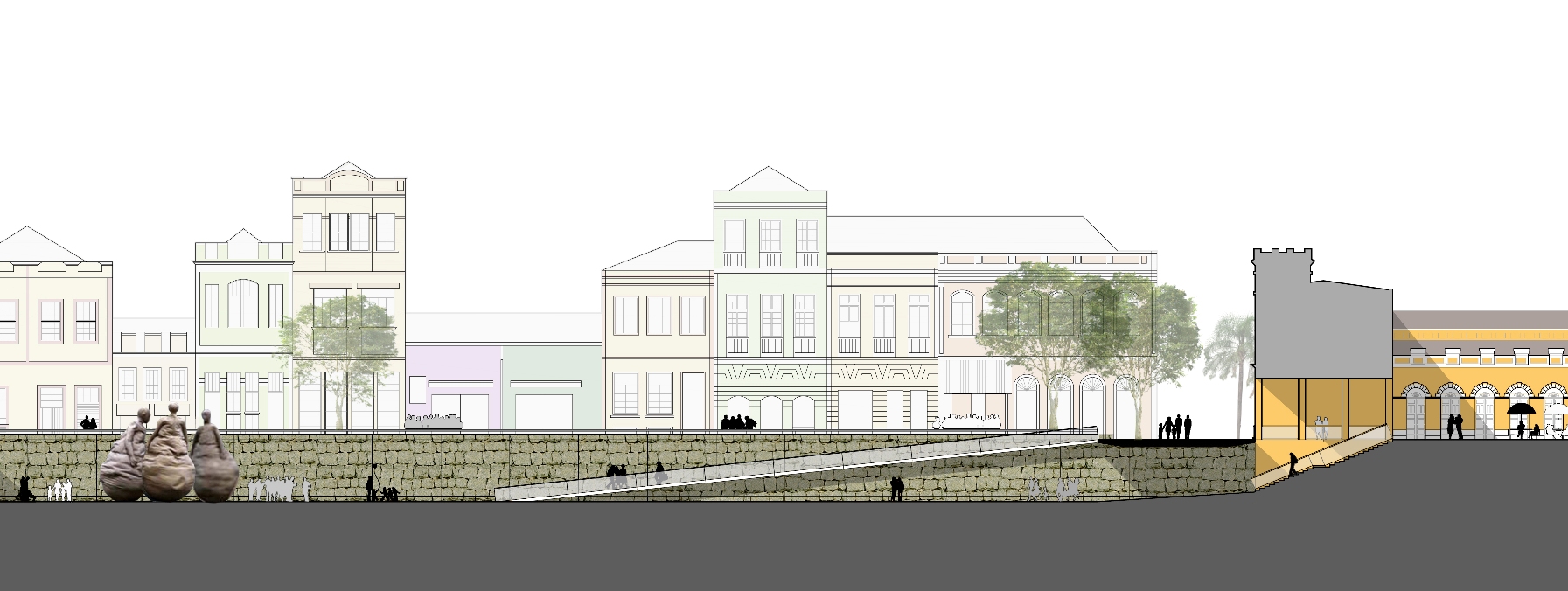 A construção da fresta proposta recupera o antigo traçado da borda do cais e restabelece um suporte visual da fachada oitocentista, agora totalmente evidenciada.