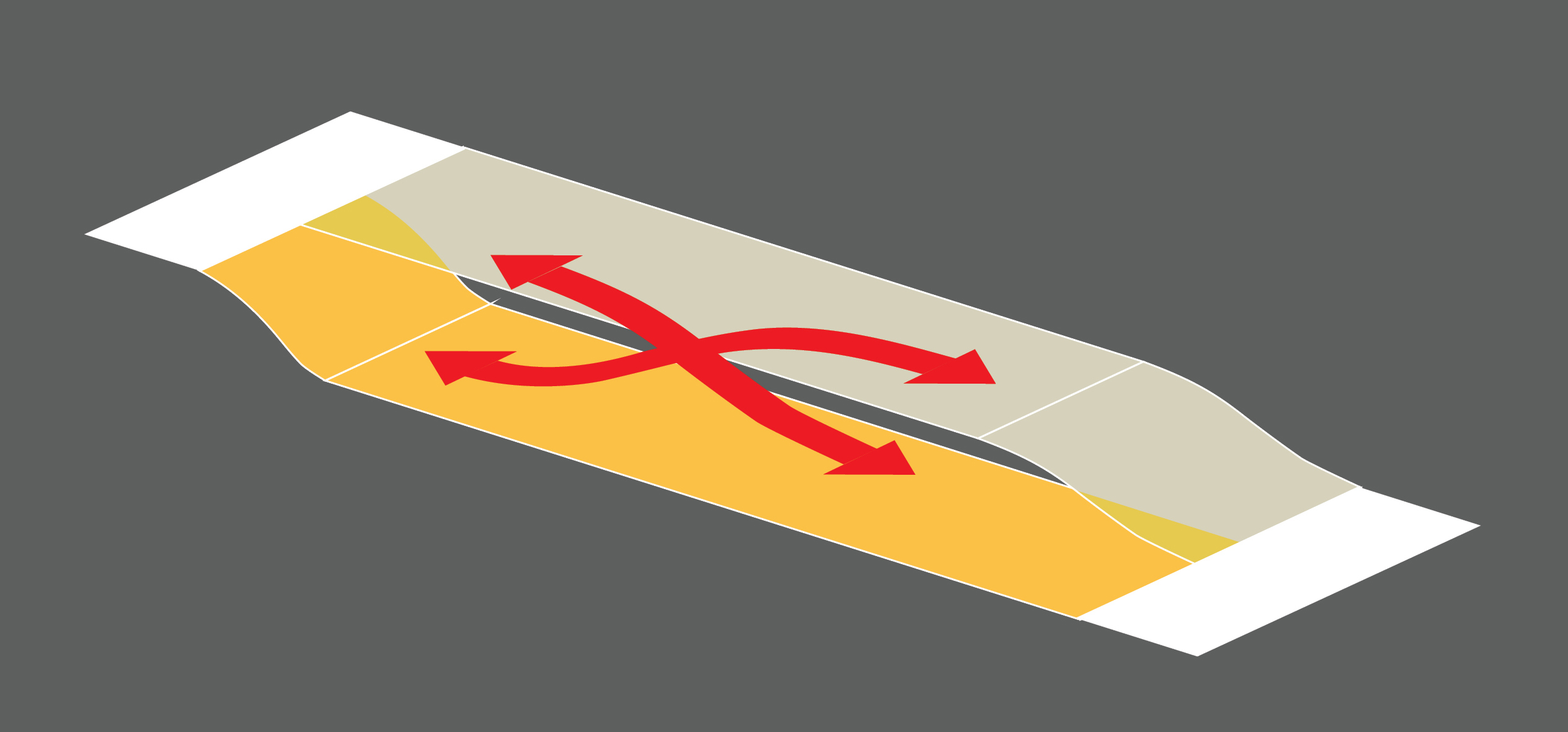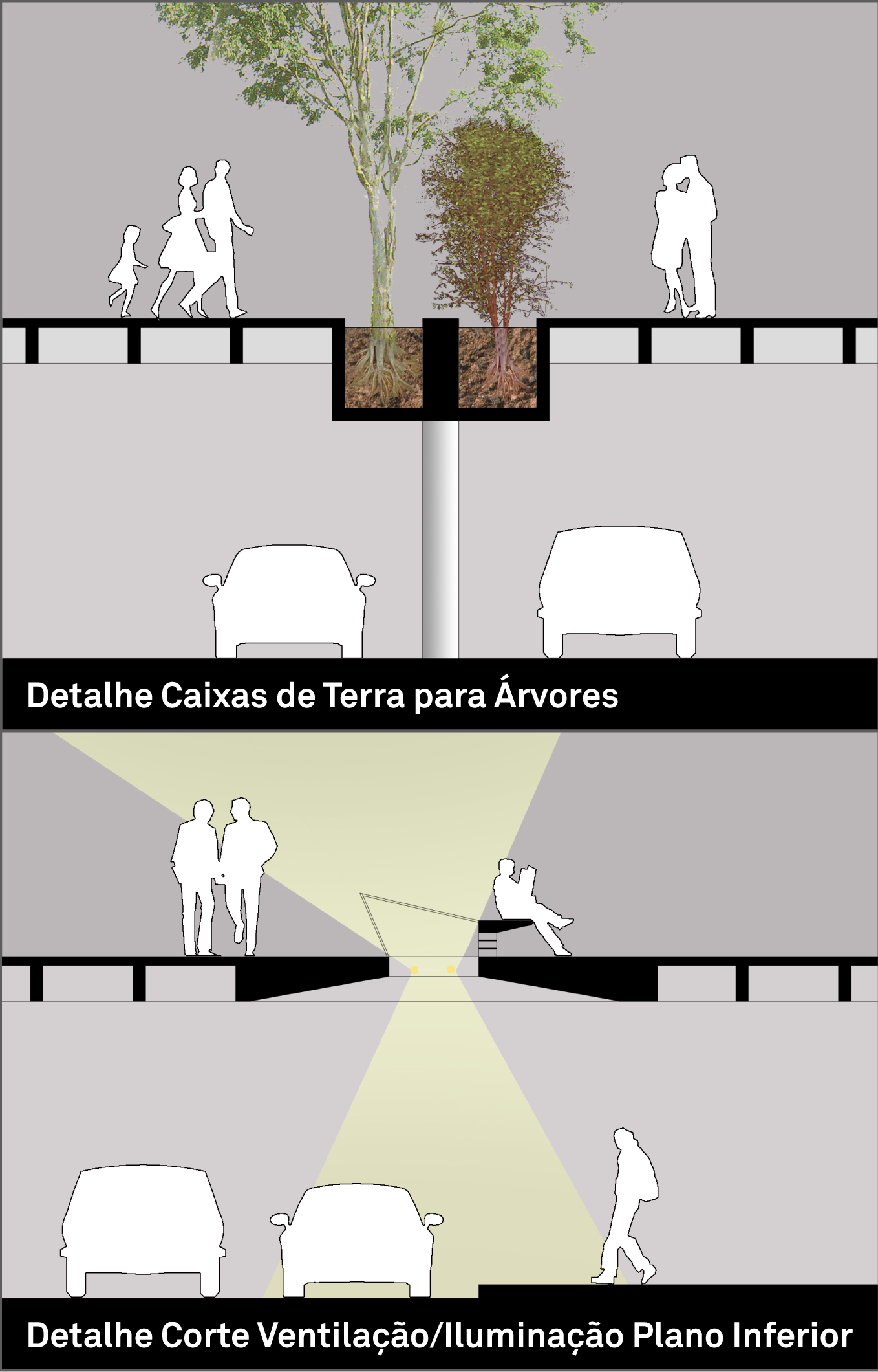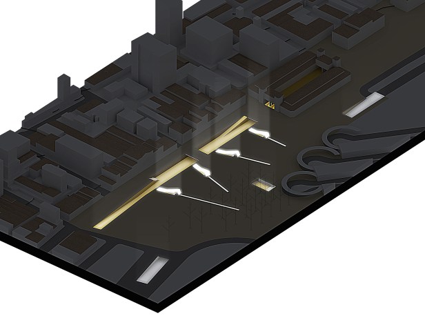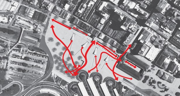 O projeto oferece uma continuidade dos fluxos de pedestres e veículos nos dois níveis através de inúmeras opções de conexão, soma de possibilidades num jogo de acontecimentos.